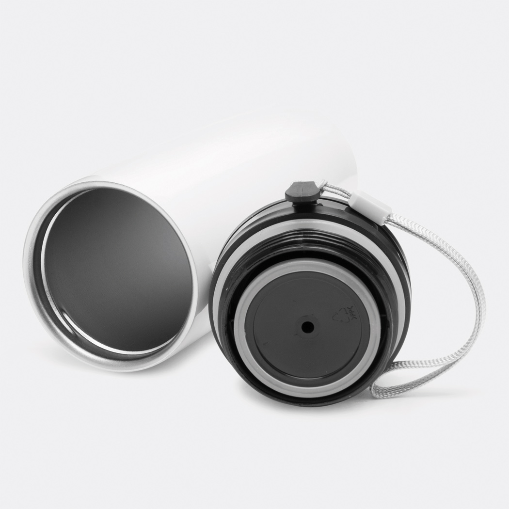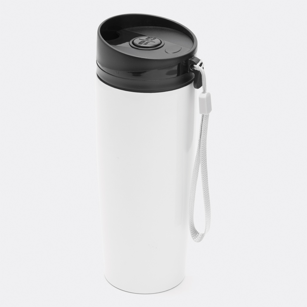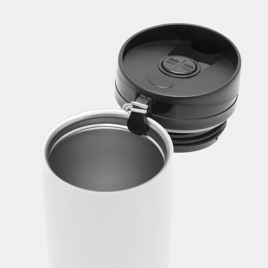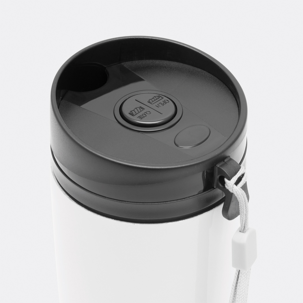 Isolierbecher EARLY MORNING, doppelwandig: innen und außen aus Edelstahl, Kunststoff-Deckel mit sicherem Schraubverschluss, Pushbutton OPEN / CLOSE und integrierter Trinköffnung, gummierter Standfuß für gute Bodenhaftung, Füllmenge ca. 380 ml, mit Handschlaufe