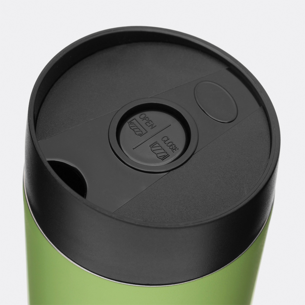 Isolierbecher FLAVOURED, doppelwandig: innen und außen aus Edelstahl, Kunststoff-Deckel mit sicherem Schraubverschluss, Push-Button OPEN / CLOSE und integrierter Trinköffnung, Füllmenge ca. 380 ml