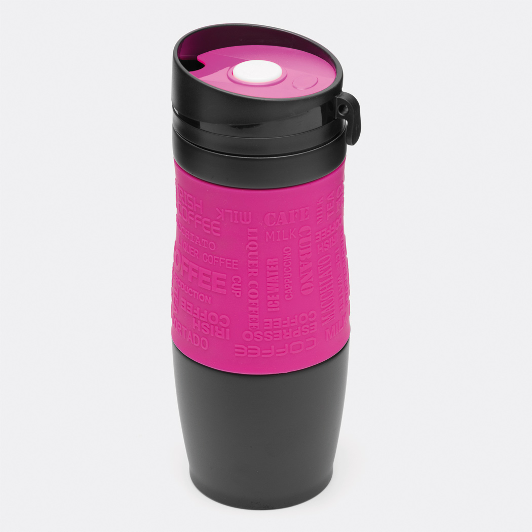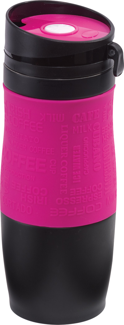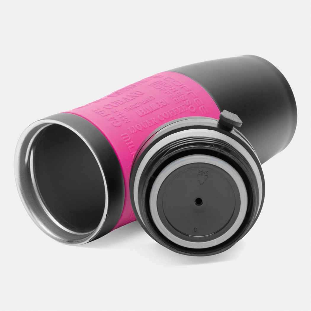 Isolierbecher GOLDEN DREAM, doppelwandig: innen und außen aus Edelstahl, Kunststoff-Deckel mit sicherem Schraubverschluss, Push-Button OPEN / CLOSE und integrierter Trinköffnung – außen Haken mit dem sich der Deckel an den Becher hängen lässt, farbig-gummierte Silikon-Manschette für optimale Griffigkeit, Füllmenge ca. 380 ml, in Geschenkbox