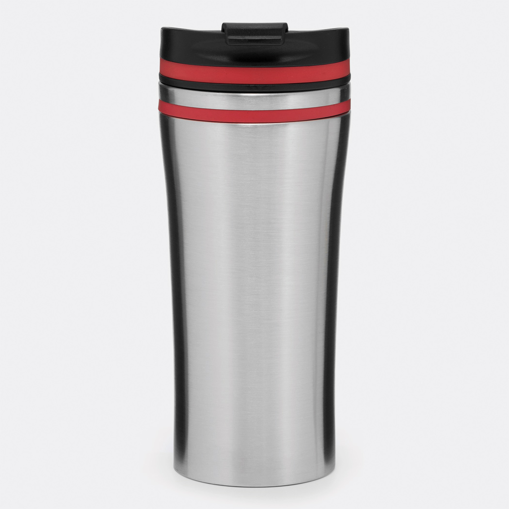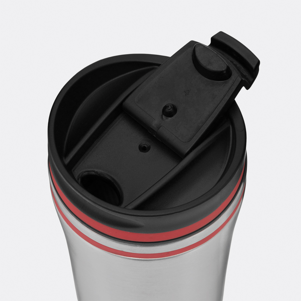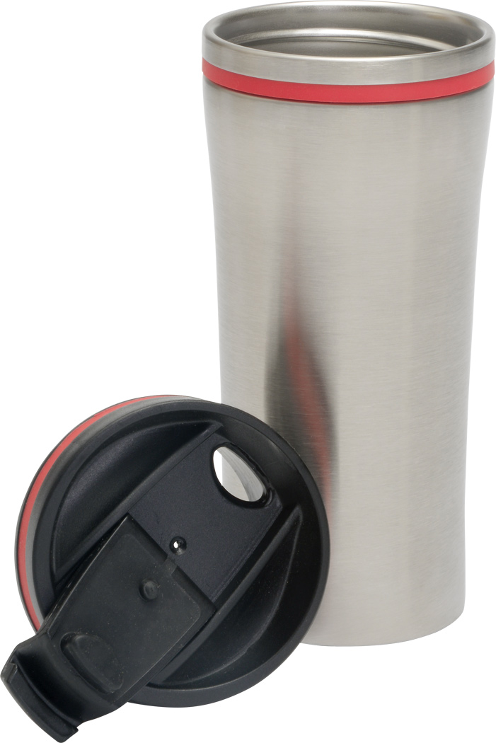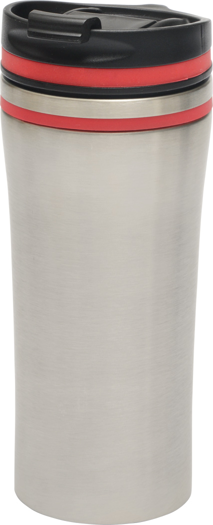 Isolierbecher LIBERICA, doppelwandig: innen und außen aus Edelstahl, Deckel mit sicherem Schraubverschluss und integrierter Trinköffnung zum Aufklappen, farbige Applikation, Füllmenge ca. 400 ml