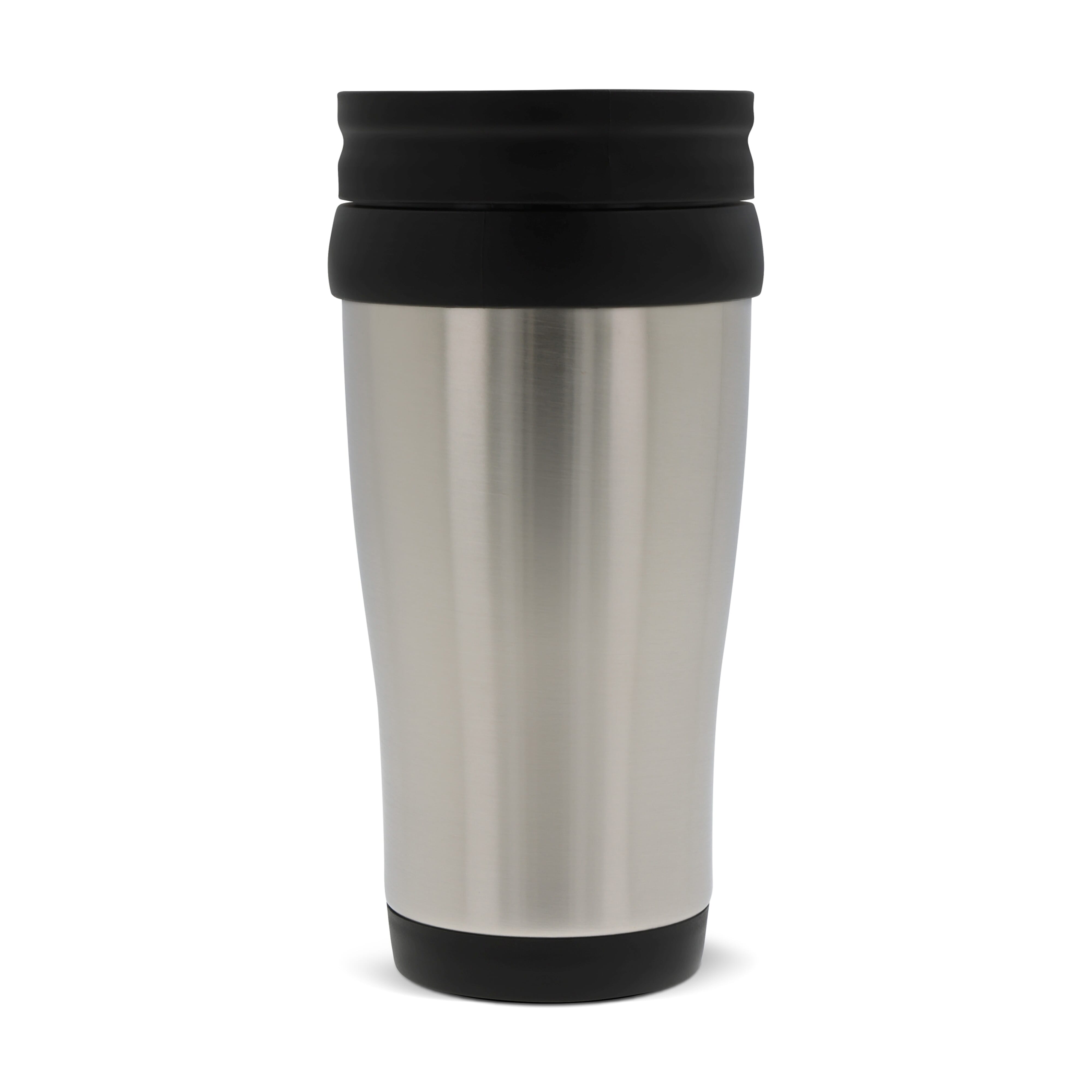 Isolierbecher speziell für das Auto. Dieser besteht außen aus Edelstahl und innen aus Kunststoff. Der Becher ist nicht auslaufsicher und sollte daher möglichst gerade transportiert werden.