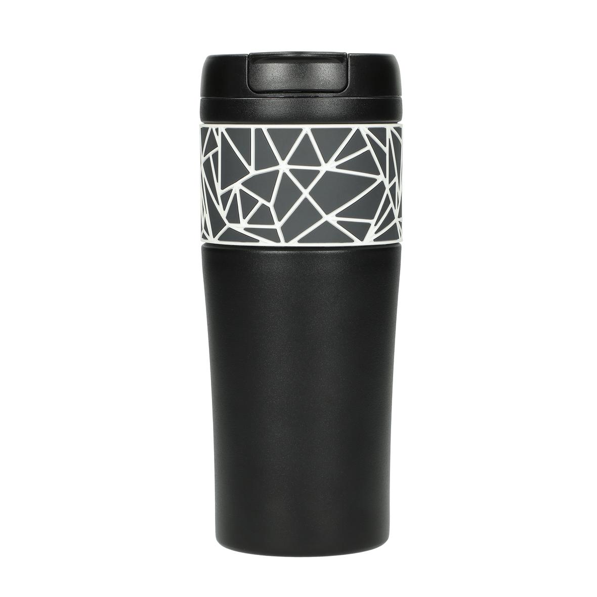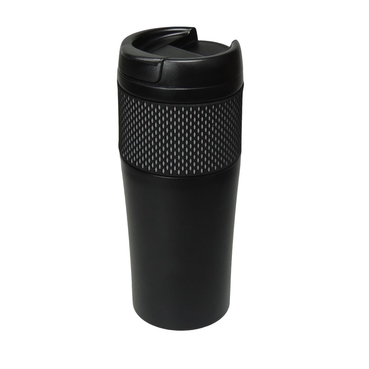 Sehr hochwertiger Isolierbecher mit grauer Manschette aus Silikon. Becher ist vakuum-isoliert und hält somit die Temperatur der Getränke länger konstant. Mit einem Schraubdeckel aus PP und einer verschließbaren Trinköffnung. Füllmenge: ca. 0,5 Liter.