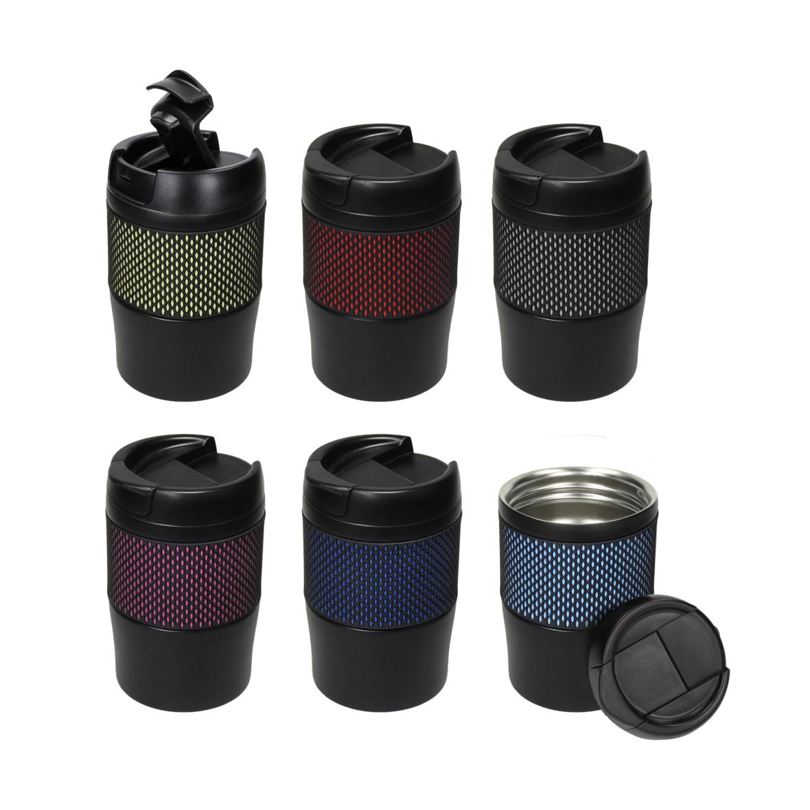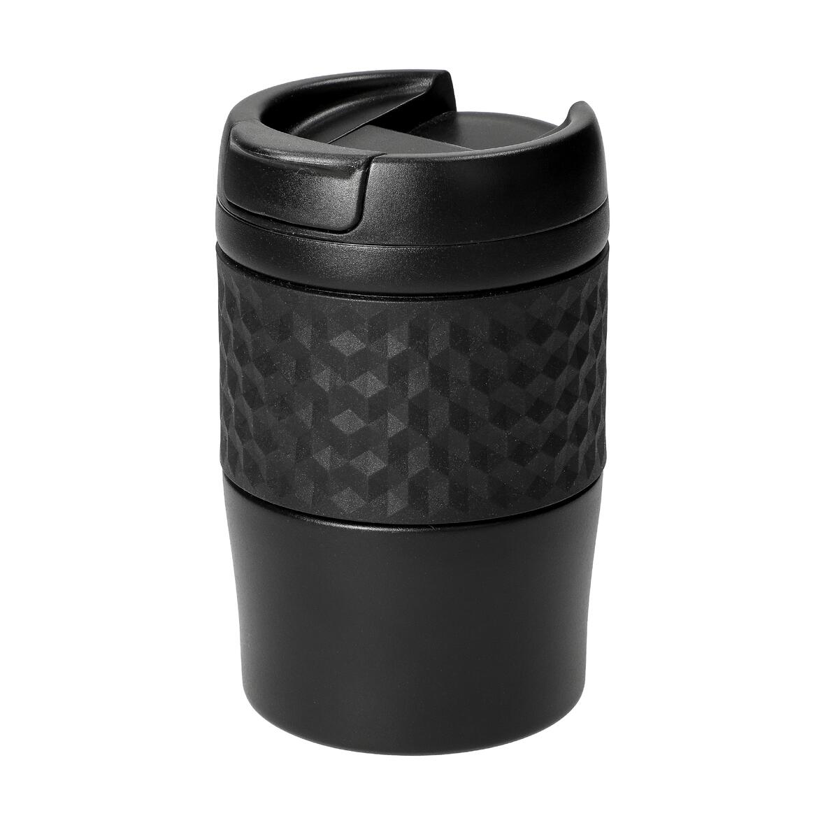 Kleiner Isolierbecher mit grauer Manschette aus Silikon. Becher ist vakuum-isoliert und hält somit die Temperatur der Getränke länger konstant. Mit einem Schraubdeckel aus PP und einer verschließbaren Trinköffnung. Füllmenge: ca. 0,3 Liter.