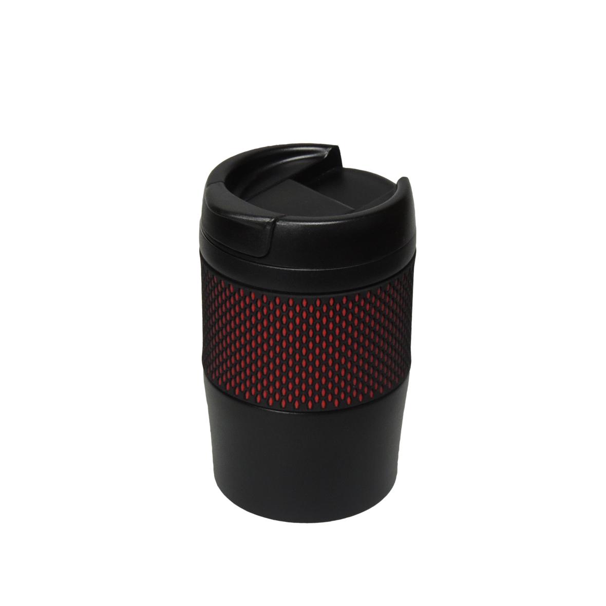 Kleiner Isolierbecher mit grauer Manschette aus Silikon. Becher ist vakuum-isoliert und hält somit die Temperatur der Getränke länger konstant. Mit einem Schraubdeckel aus PP und einer verschließbaren Trinköffnung. Füllmenge: ca. 0,3 Liter.