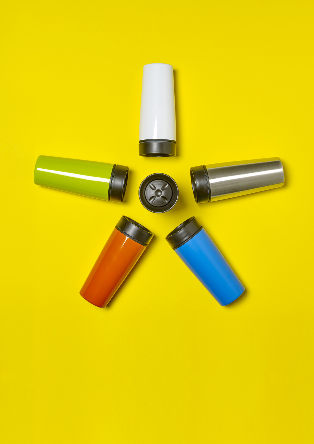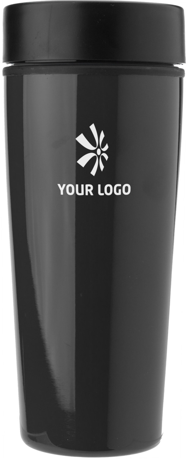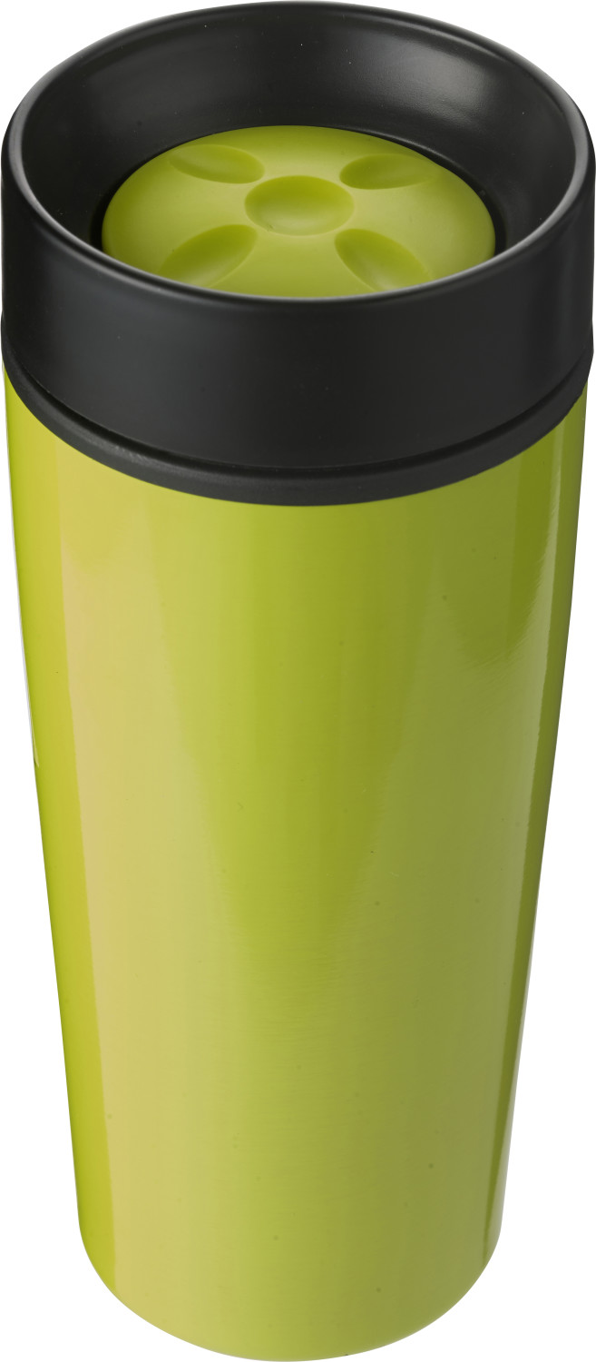Isolierbecher aus Edelstahl, farbig lackiert, doppelwandig, mit Anti-Rutsch-Matte auf der Unterseite, Kunststoff-Deckel und Schnellverschluss, Inhalt ca. 450 ml.