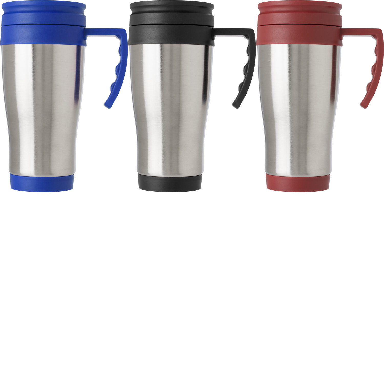 Isolierbecher aus Edelstahl, mit Kunststoffgriff, Kunststoffdeckel und verschließbarem Mundstück, Inhalt ca. 420 ml.