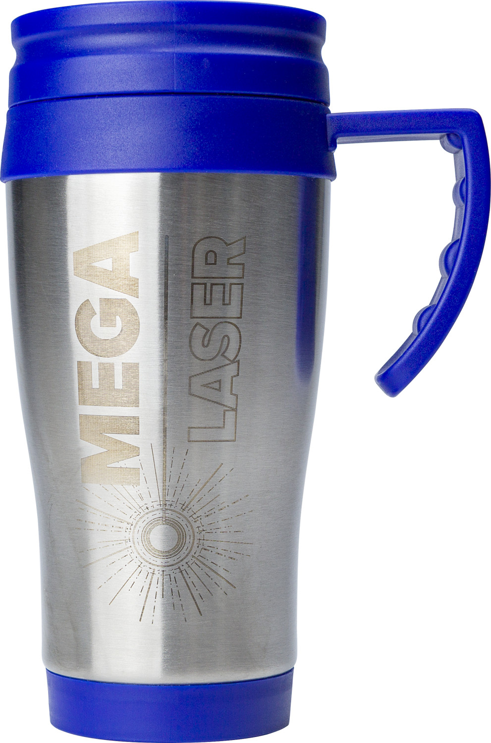 Isolierbecher aus Edelstahl, mit Kunststoffgriff, Kunststoffdeckel und verschließbarem Mundstück, Inhalt ca. 420 ml.