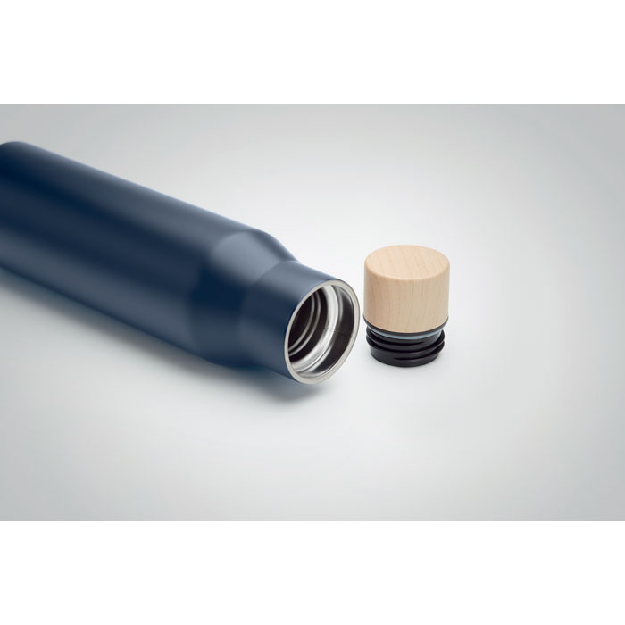 Doppelwandige Isolierflasche aus Edelstahl. Verschluss aus Bambus- Imitat. Füllmenge: 500 ml. Auslaufsicher.