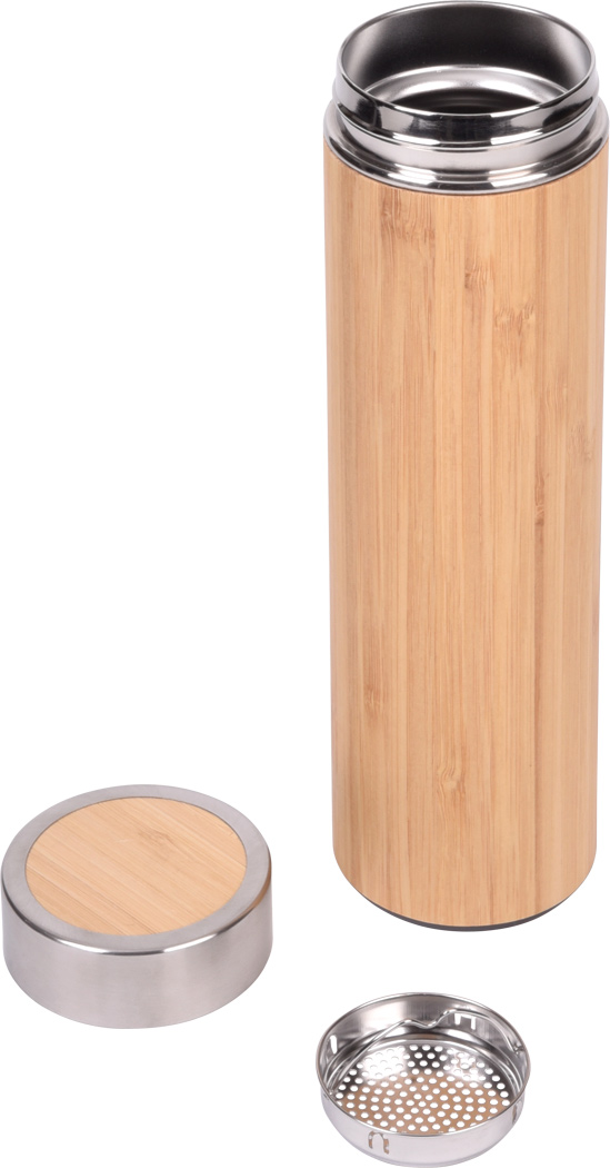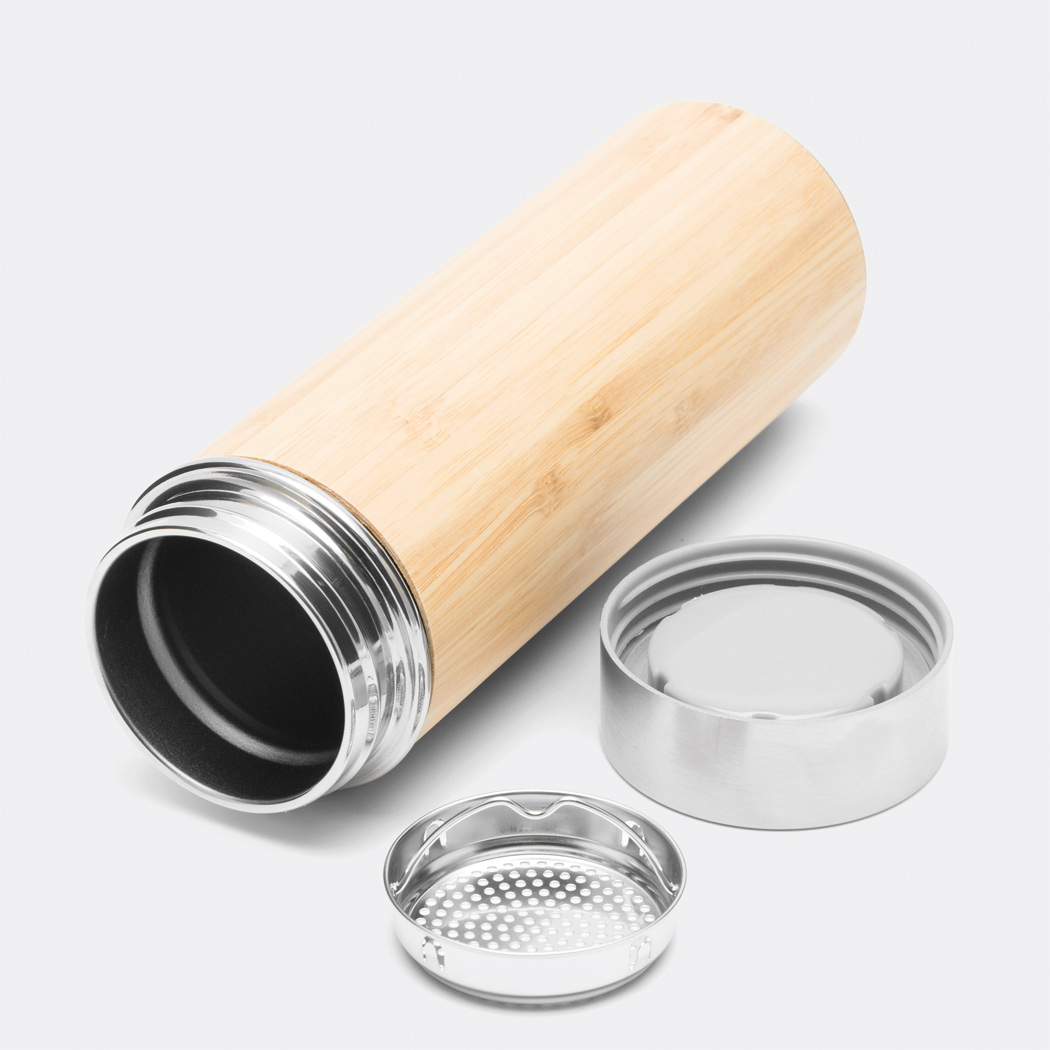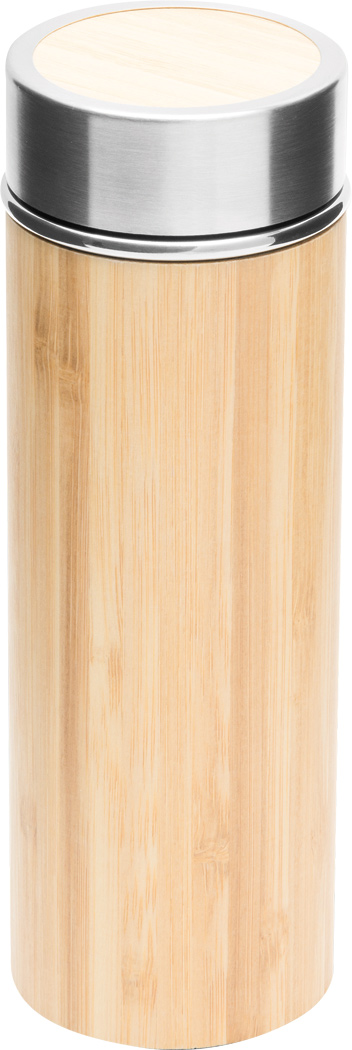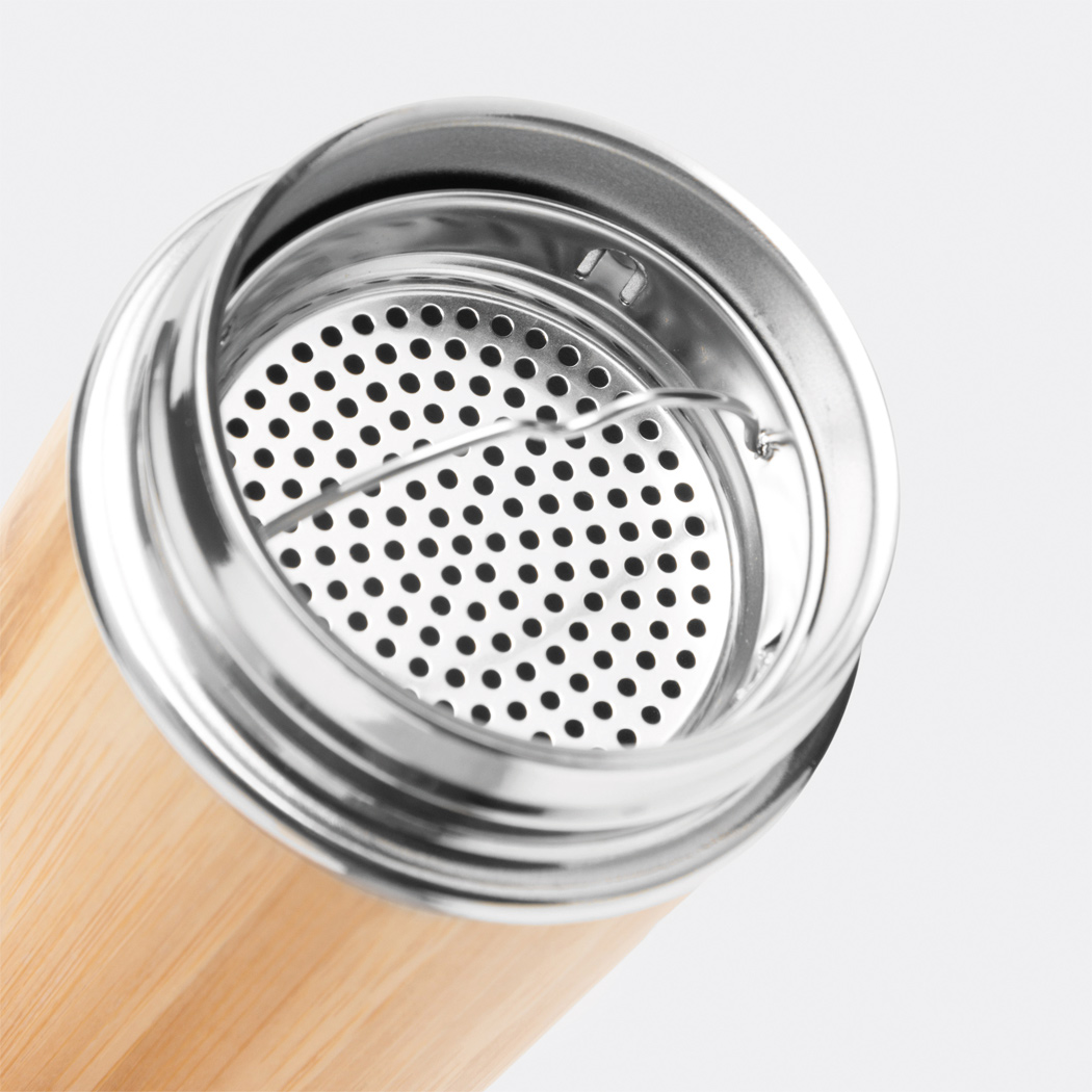 Vakuum-Isolierflasche BAMBOO GO, doppelwandig: innen und außen aus Edelstahl, mit Bambus-Ummantelung, Deckel mit sicherem Schraubverschluss und Silikondichtung, mit herausnehmbarem Teesieb, Füllmenge ca. 350 ml