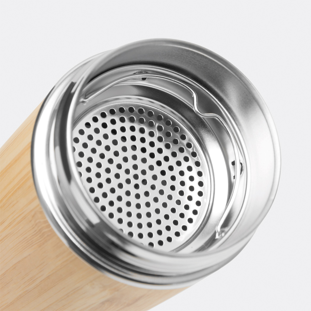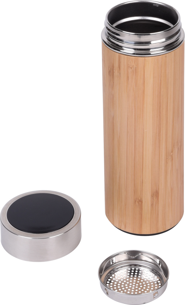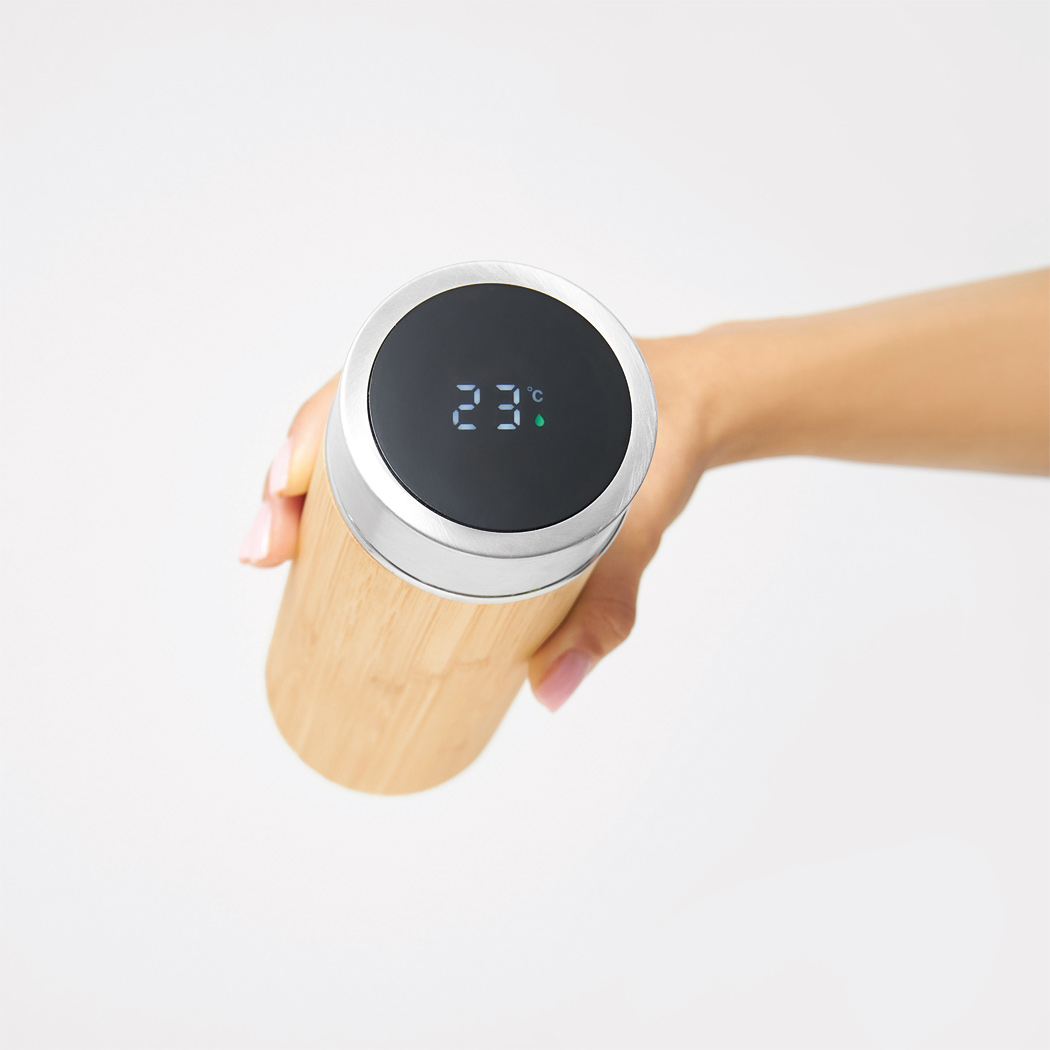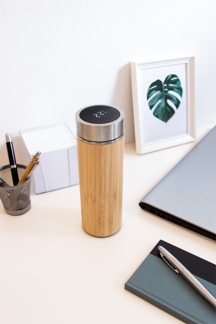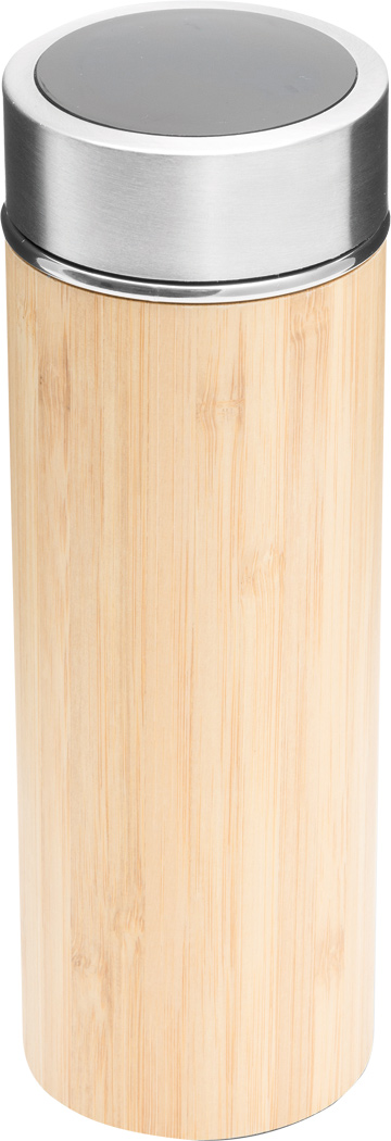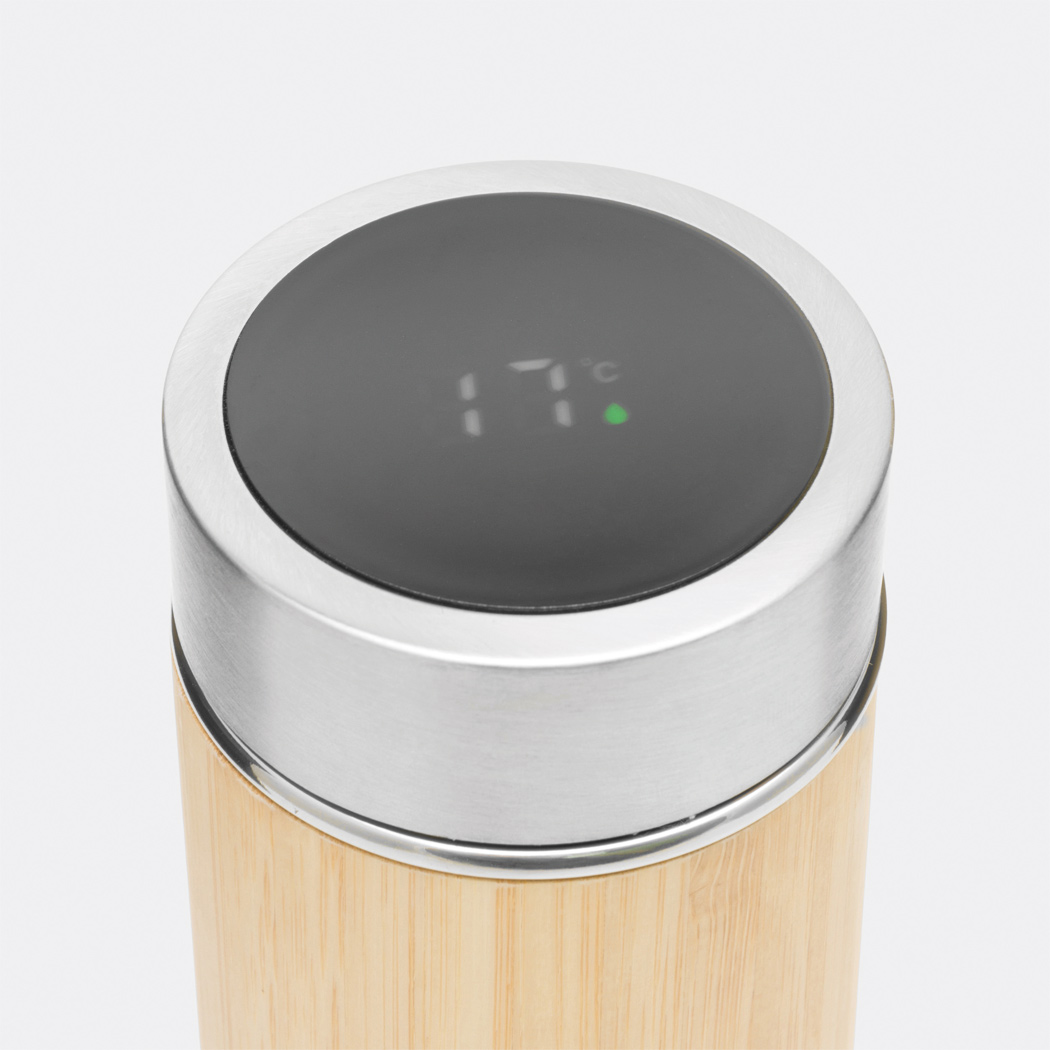 Vakuum-Isolierflasche BAMBOO TEMP, doppelwandig: innen und außen aus Edelstahl, mit Bambus-Ummantelung, Deckel mit sicherem Schraubverschluss, Silikondichtung und integriertem digitalen Thermometer, mit herausnehmbarem Teesieb, Füllmenge ca. 400 ml