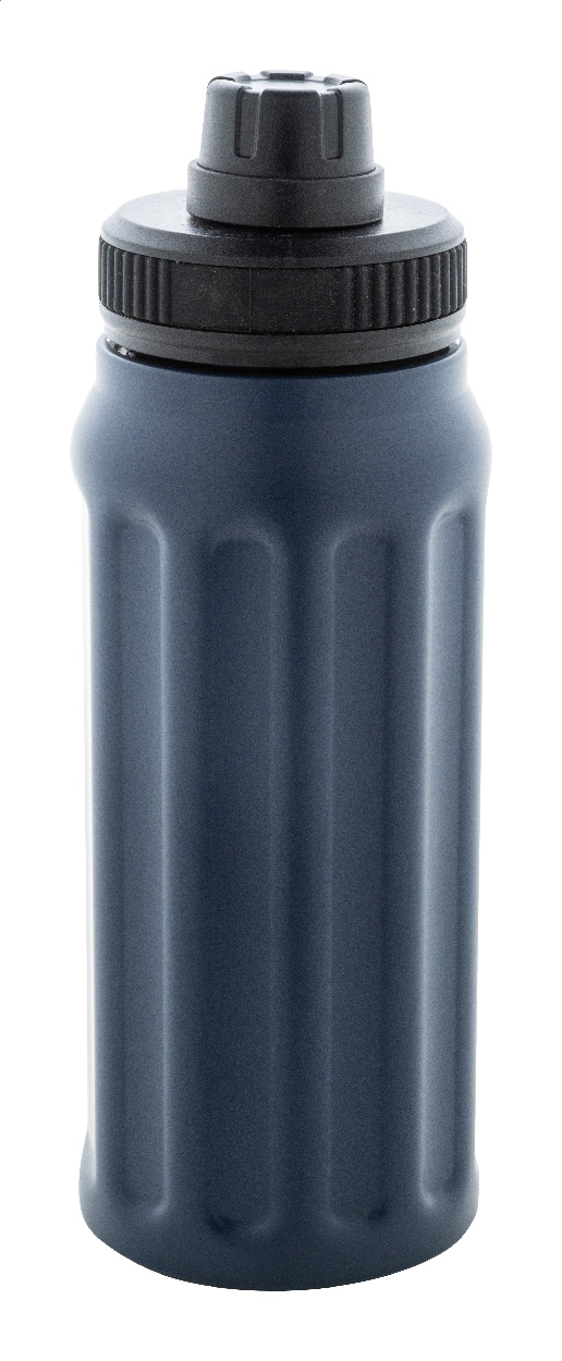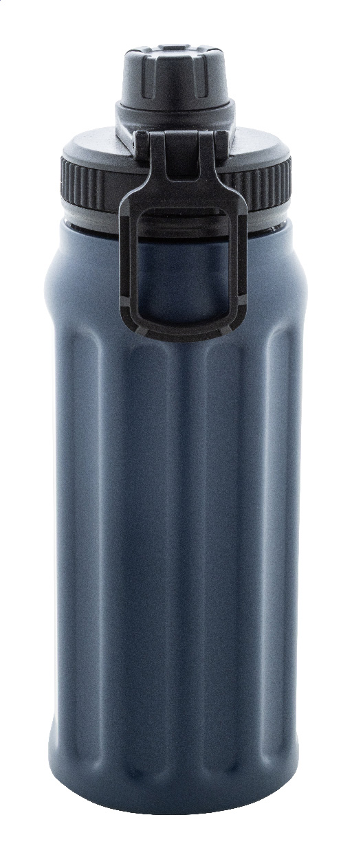 Doppelwandige, isolierte Vakuumflasche aus recyceltem Edelstahl mit vertikalen Rillen. Mit PP-Trinkdeckel und integriertem Tragegriff. Füllmenge: 540 ml.
