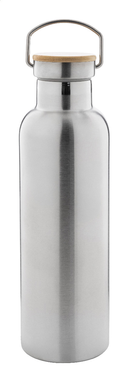 Doppelwandige, vakuumisolierte Flasche aus recyceltem Edelstahl mit Tragedeckel aus Bambus. Füllmenge: 750 ml.
