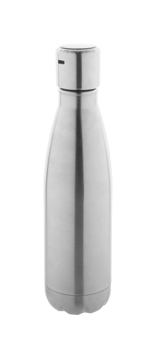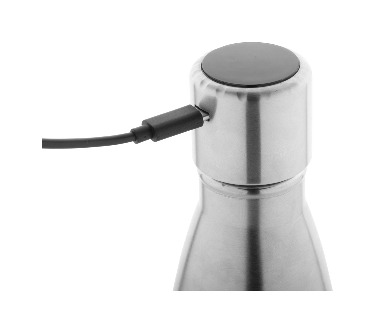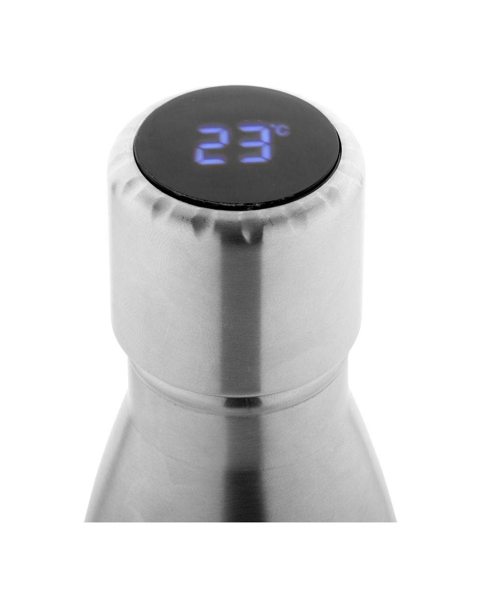 Doppelwandige Vakuumflasche aus recyceltem Edelstahl mit LED Touch-Thermometer auf dem Deckel und eingebautem Akku. Füllmenge: 500 ml. Inkl. USB-Ladekabel.
