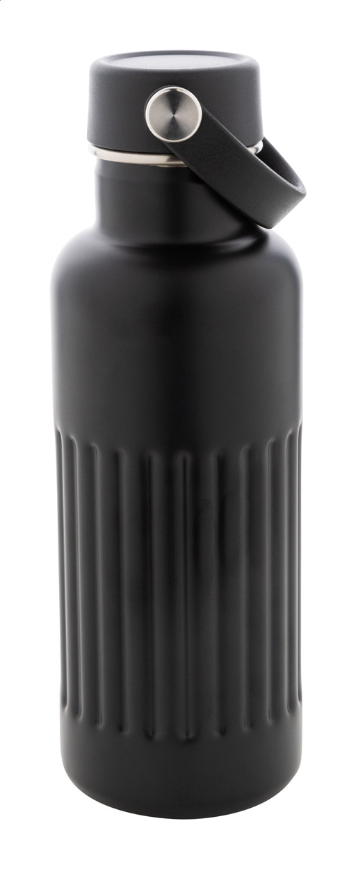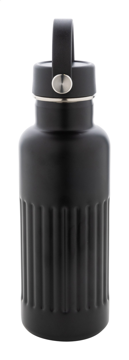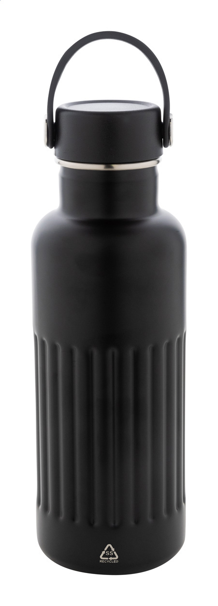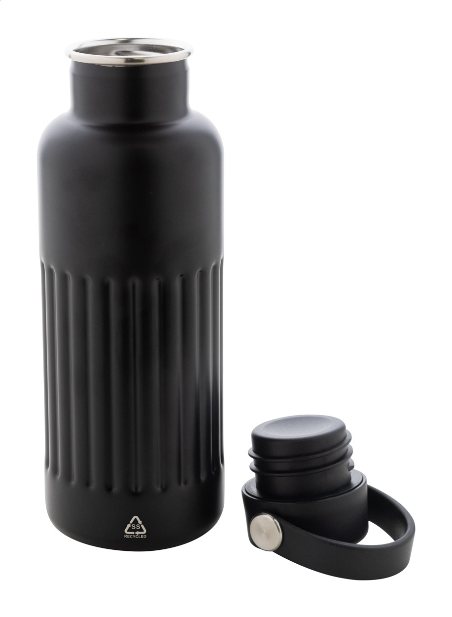 Doppelwandige, recycelte Edelstahl-Trinkflasche mit Vakuumisolierung und PP-Kunststoff-Trageverschluss. Füllmenge: 500 ml.