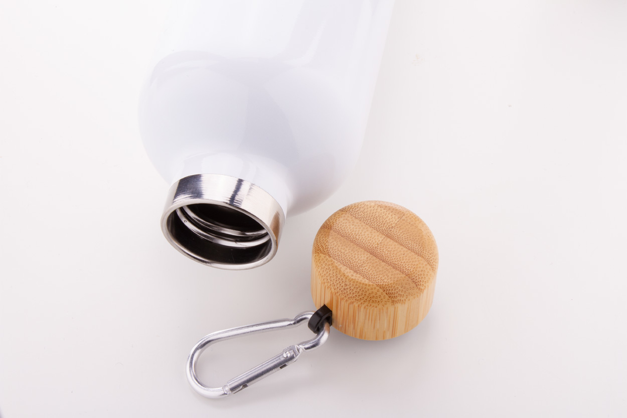 Doppelwandige, vakuumisolierte Edelstahlflasche mit Bambusverschluss und Karabiner. Füllmenge: 500 ml.