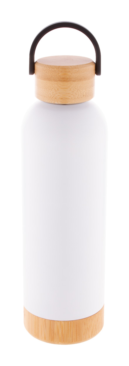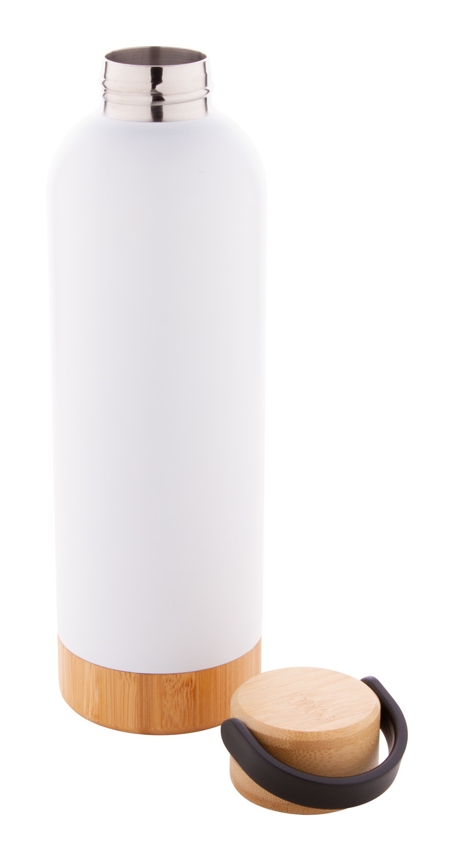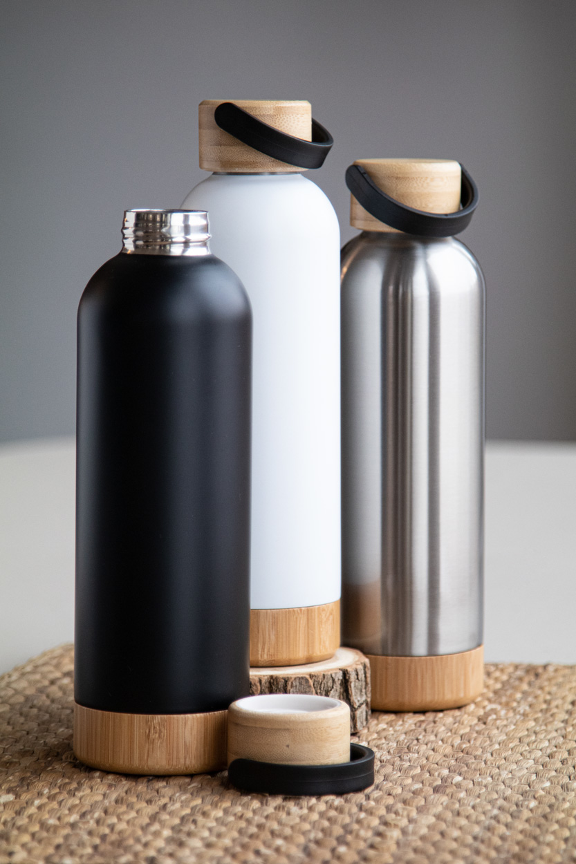 Doppelwandige, vakuumisolierte Edelstahlflasche mit Tragedeckel und -boden aus Bambus. Füllmenge: 500 ml.