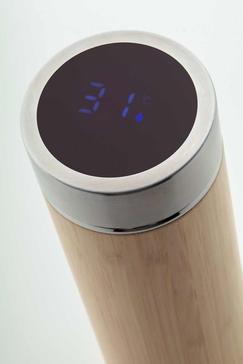Doppelwandige Isolierflasche aus Edelstahl und Bambus mit Tee-Ei und LED-Touch-Thermometer auf dem Deckel. Füllmenge: 500 ml. Inkl. Knopfzellenbatterie.