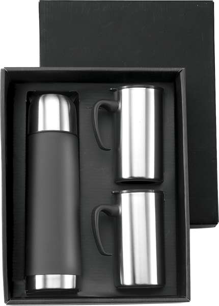 Isolierkannen-Set, doppelwandig, mit Schnellverschluss, farbig lackiert, Set bestehend aus Isolierkanne (Inhalt ca. 500 ml) und zwei doppelwandigen Thermobechern (Inhalt ca. 250 ml), inkl. Geschenkbox.