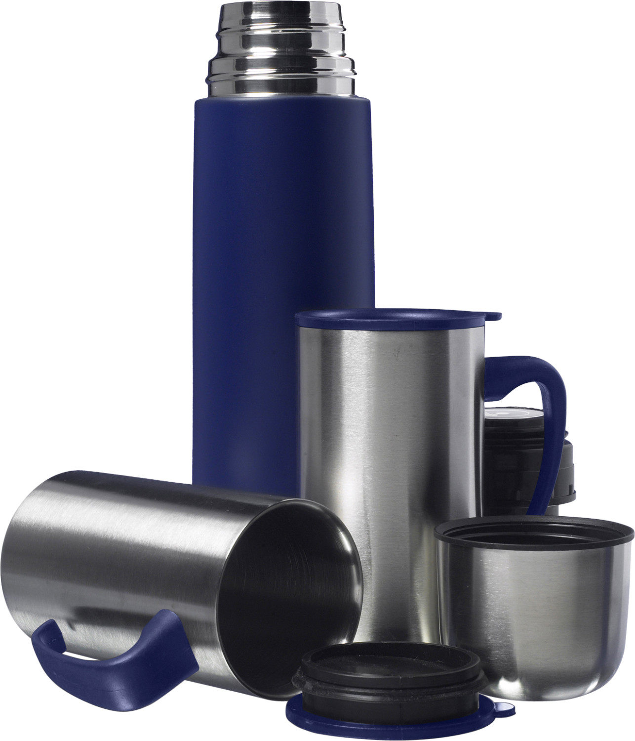 Isolierkannen-Set, doppelwandig, mit Schnellverschluss, farbig lackiert, Set bestehend aus Isolierkanne (Inhalt ca. 500 ml) und zwei doppelwandigen Thermobechern (Inhalt ca. 250 ml), inkl. Geschenkbox.