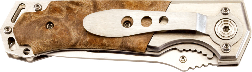 Taschenmesser HUNTER: mit Klappmechanismus, breiter Klinge aus Edelstahl, Holzapplikation am Griff und Gürtel-Clip, im Holzetui