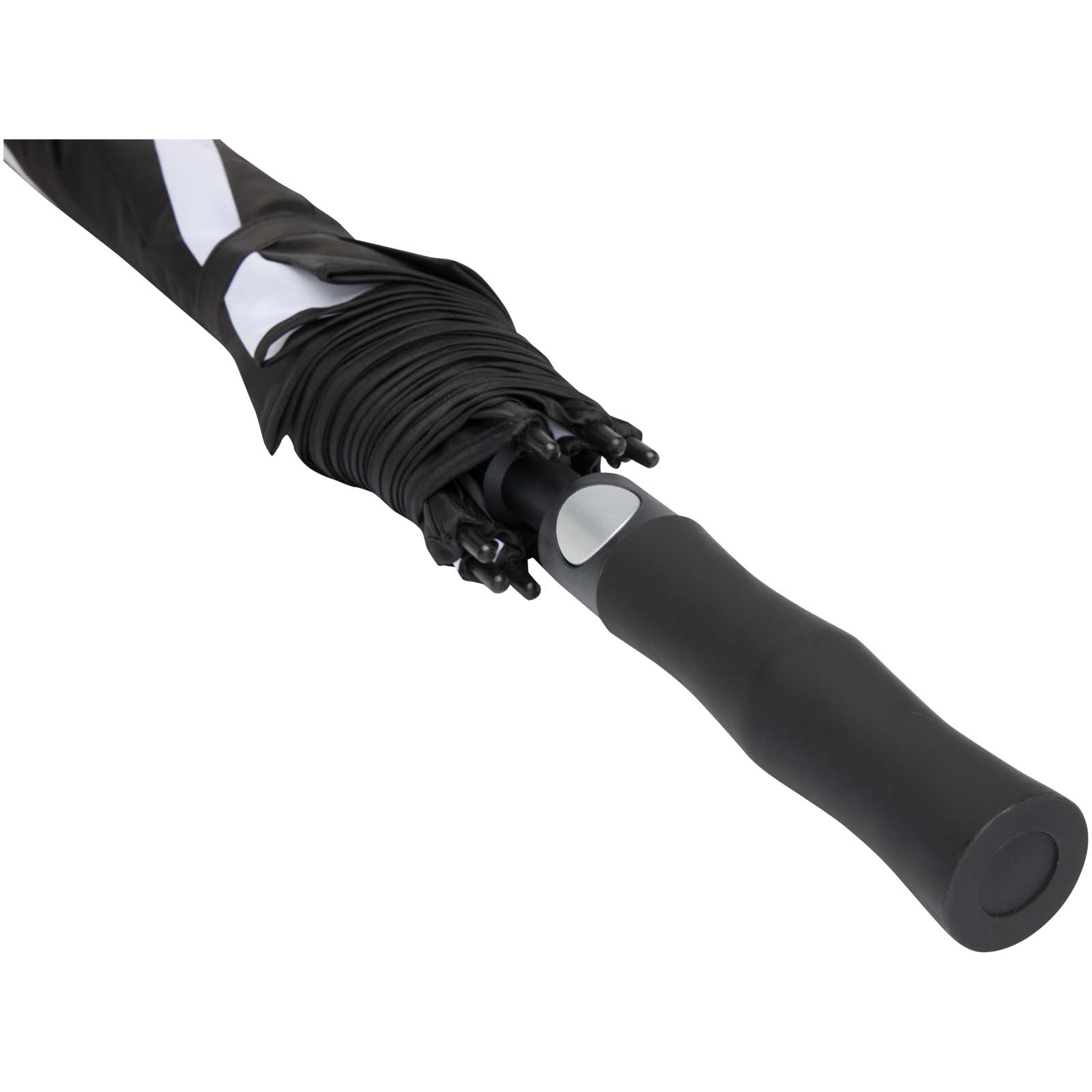 Der windfeste Golfschirm Jeff überzeugt mit einem großzügigen 55" Schirmdach aus Polyester, das bequem mehreren Personen Schutz bietet. Der robuste Schaft und Rahmen aus Fiberglas sorgen für hohe Flexibilität und Widerstandsfähigkeit bei starkem Wind. Der praktische Kunststoffgriff mit automatischer Öffnung ermöglicht schnelles und bequemes Handling. Die kontrastfarbenen Schirmsegmente bieten eine ideale Fläche für auffälliges Branding – perfekt für Events, Werbeaktionen oder den Alltag.