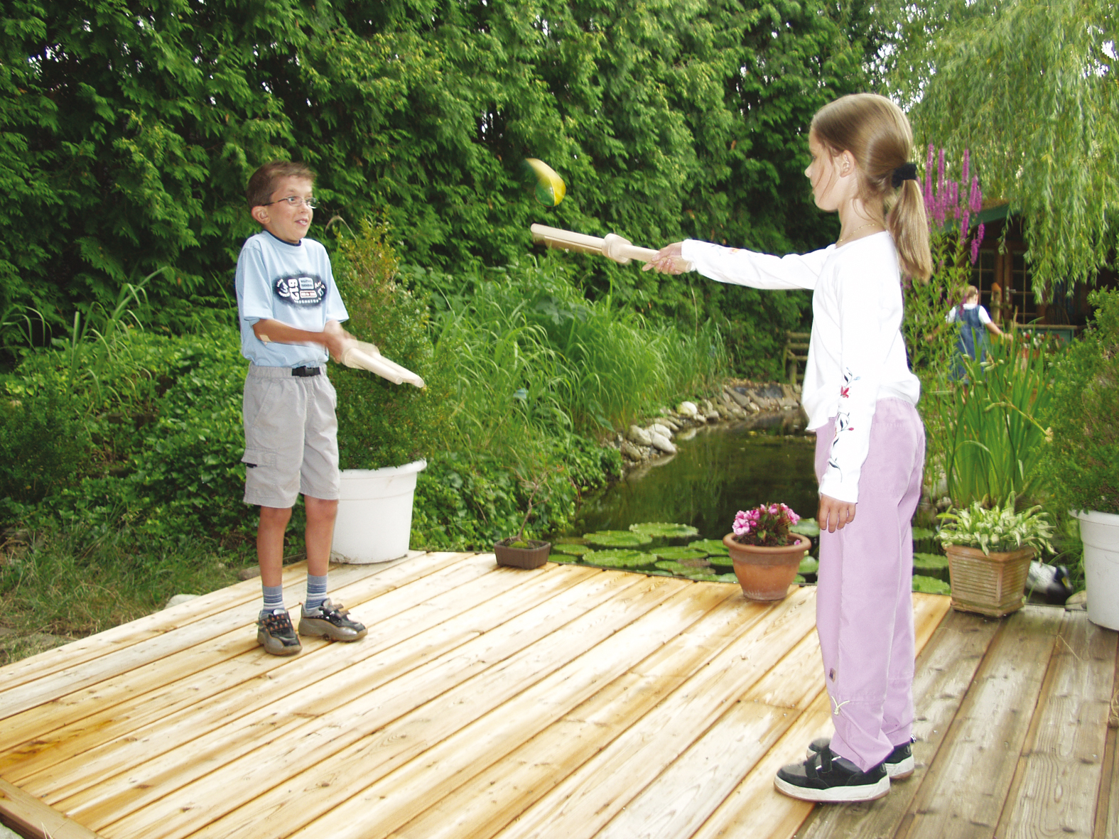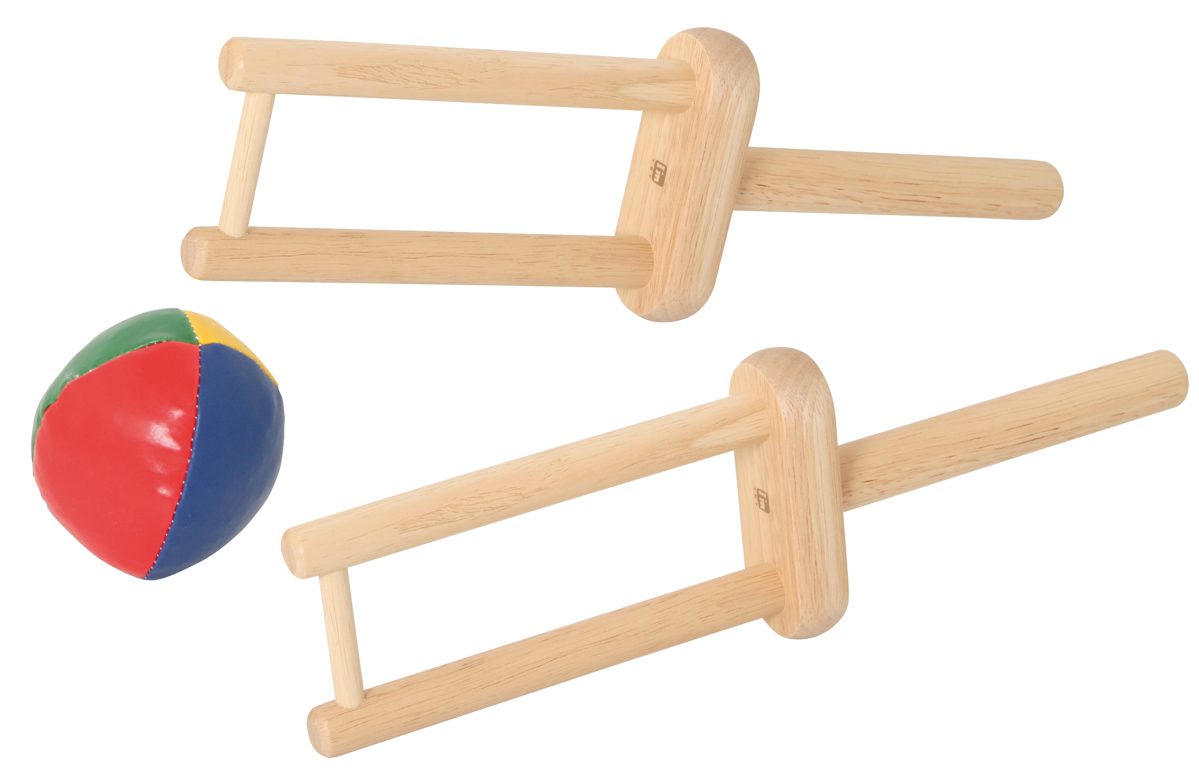 Sportliche Spielidee für zwei Leute von 5 - 99 Jahren. Es gilt, den Jonglierball mit einem Holzschläger zu fangen und ihn zum Gegner zurück zu werfen. Auch kleine Kinder können damit fangen üben, da der Ball nicht vom Schläger abspringt!