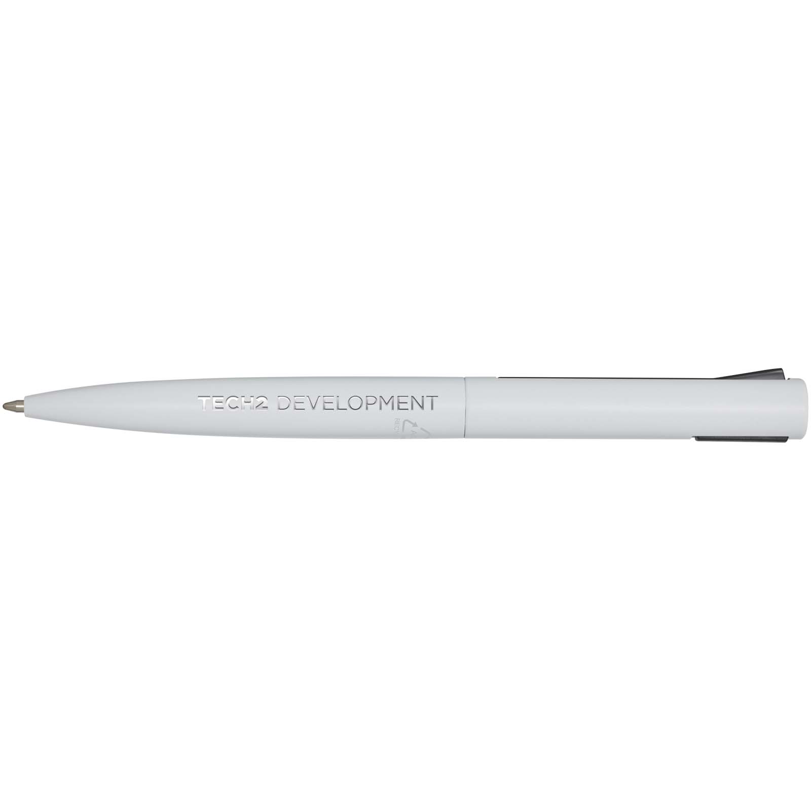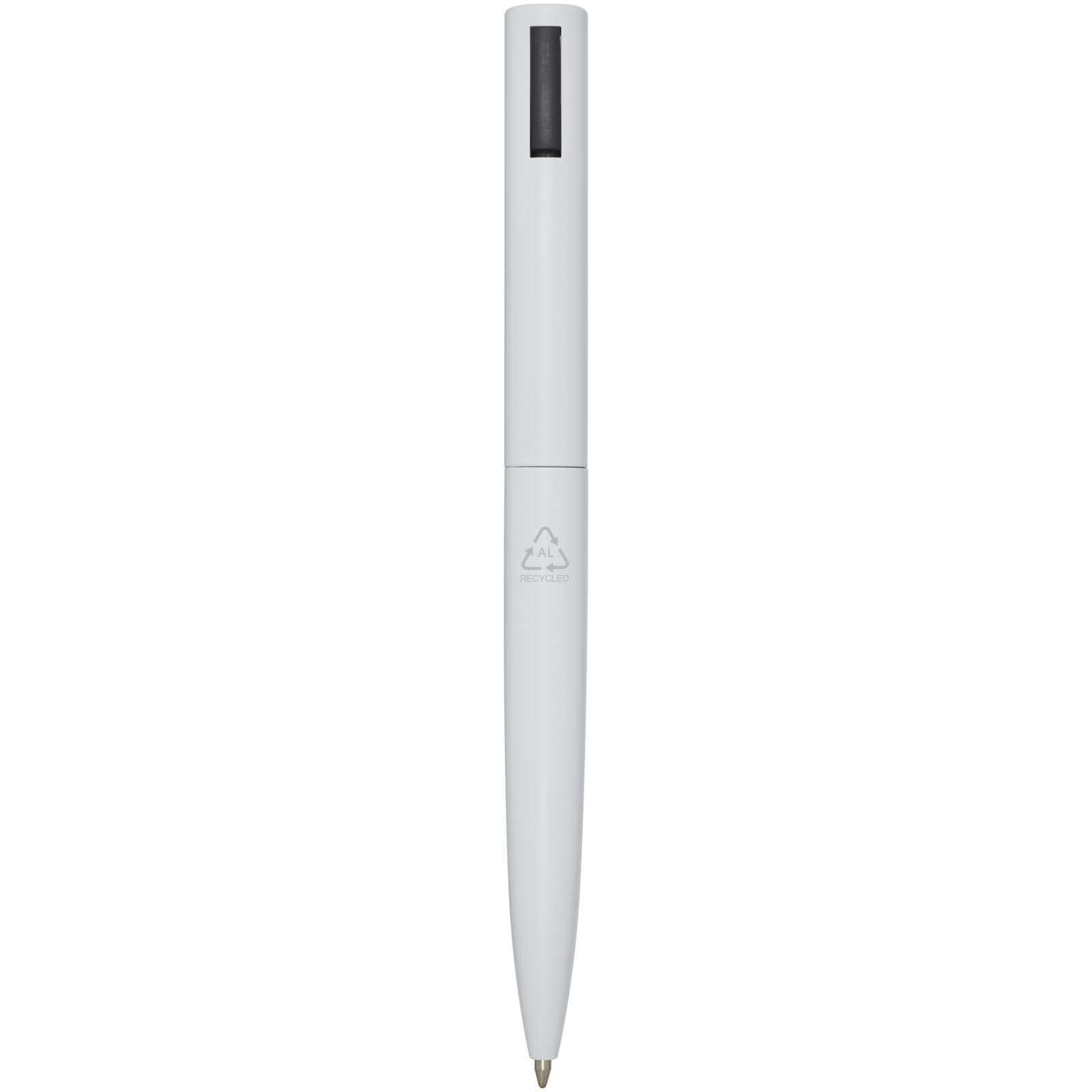 Kugelschreiber, dessen oberer Schaft aus recyceltem Kunststoff und dessen unterer Teil aus recyceltem Aluminium besteht. Der Clip besteht aus Eisen. Tintenfarbe: Blau. Schreiblänge: 1000 Meter. Strichstärke: 1,0 mm.