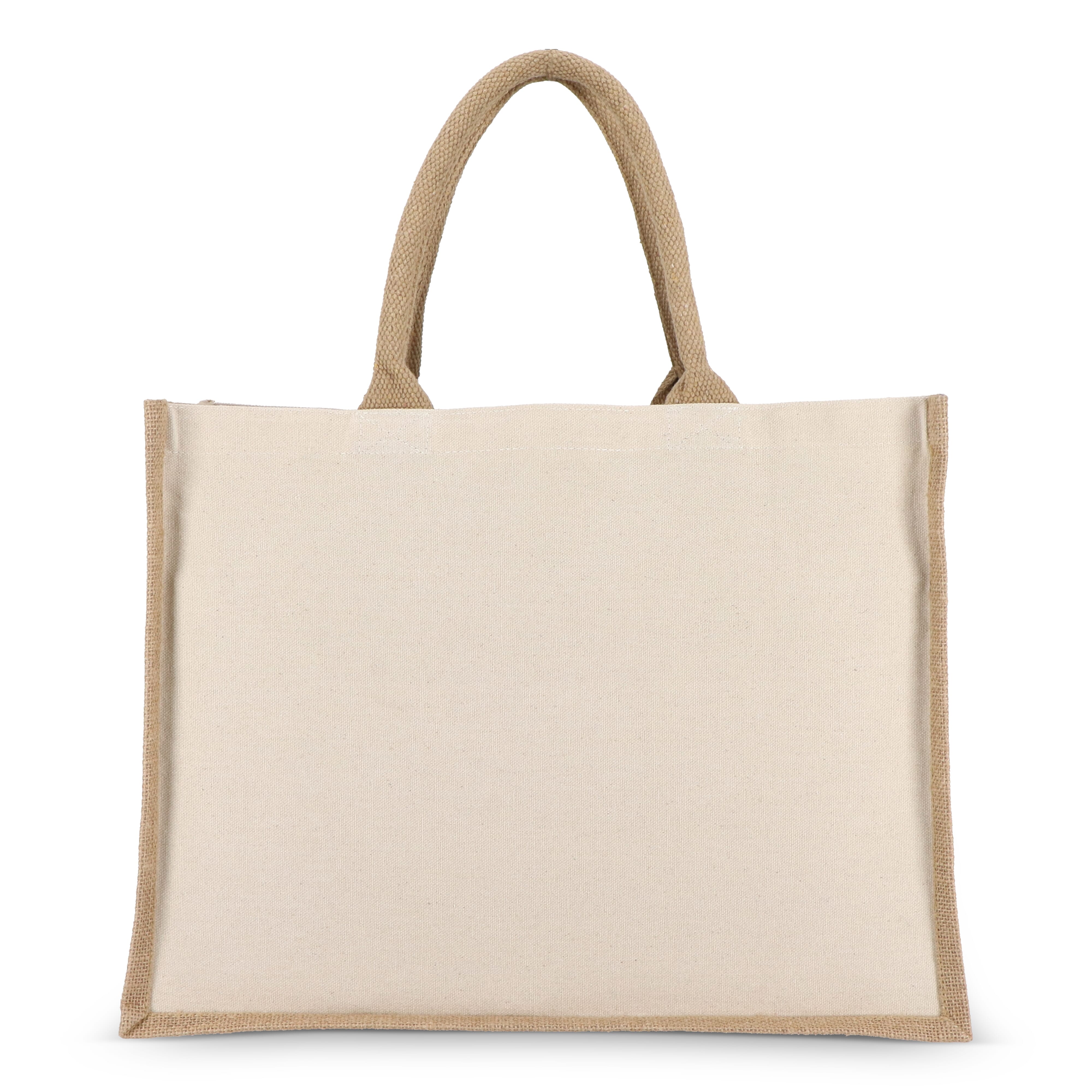 Tasche mit Vorder- und Rückseite aus natürlichem Baumwoll-Canvas, kombiniert mit Seiten und Boden aus Jute - alles 320 g / m². Ausgestattet mit farblich abgestimmten Baumwollgriffen für ein einheitliches, natürliches Aussehen. Oeko-Tex®-zertifiziert. Ideal für den Einzelhandel, Veranstaltungen oder den täglichen Gebrauch.