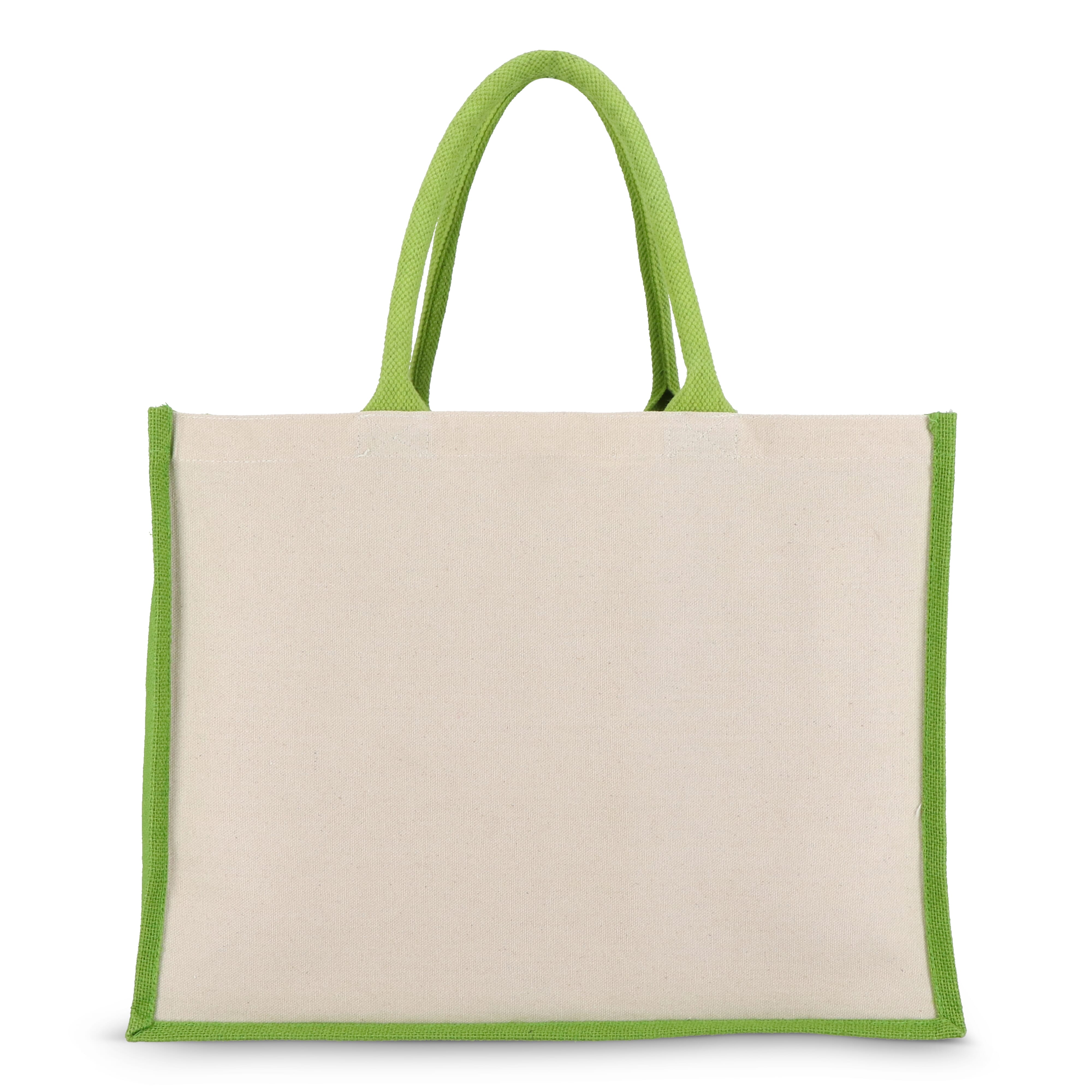 Elegante Tasche mit Vorder- und Rückwand aus Baumwoll-Canvas und Seiten und Boden aus Jute - alles 320 g / m². Die Baumwollgriffe und Seitenwände in Akzentfarben sorgen für zusätzlichen optischen Reiz. Oeko-Tex®-zertifiziert. Ideal für den Einzelhandel, Veranstaltungen oder den täglichen Gebrauch.