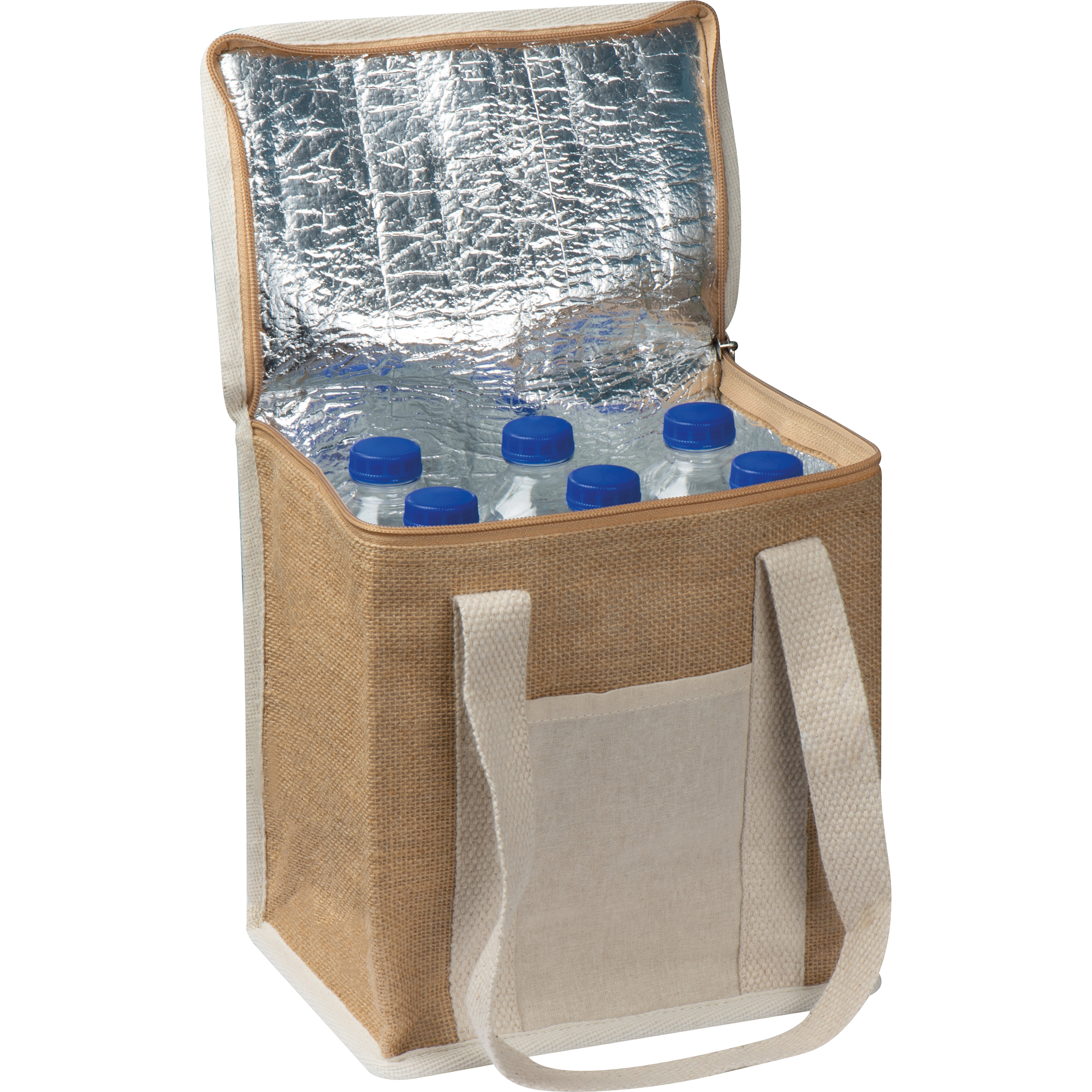 Kühltasche aus feuchtigkeitsbeständiger, laminierter Jute und isolierender Innenseite aus Aluminium mit Reißverschluss und extra Höhe, passend für 6 x 500 ml Flaschen. Die Griffe, sowie die Außentasche, auf die ihre Werbung gedruckt wird, sind aus Baumwolle.