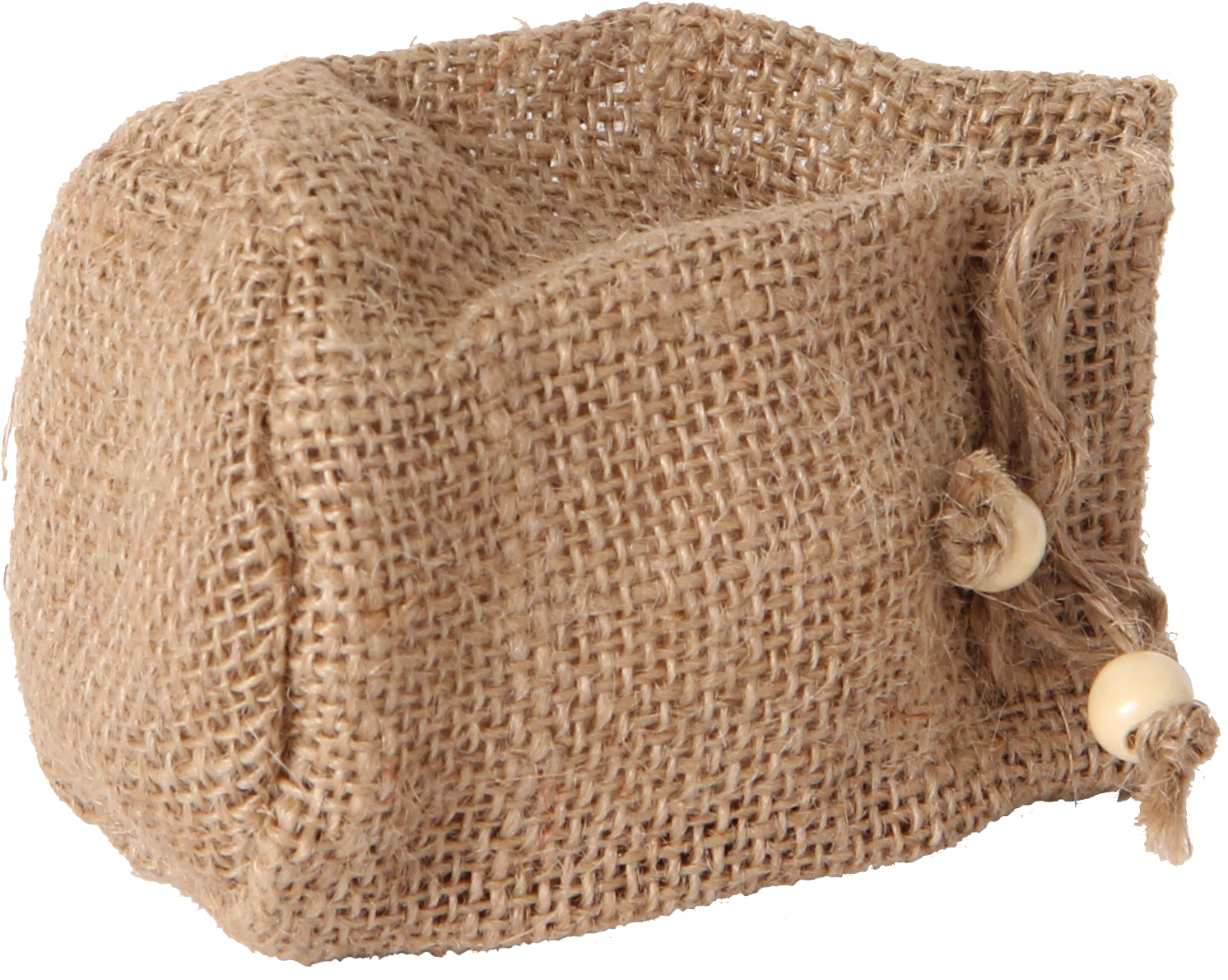 Säckchen aus Jute mit eingenähtem runden Boden und Zugbändern mit Holzkugeln zum Verschließen.