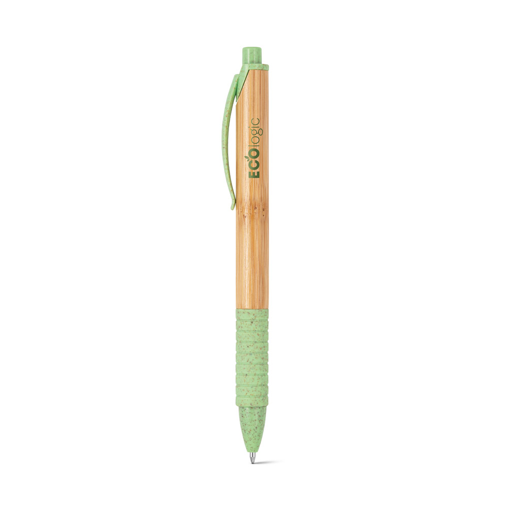 Kugelschreiber aus Bambus mit blauschreibender Mine. Der Clip und Gummigriff sind aus Weizenstrohfaser und ABS. Da das Produkt aus natürlichen Materialien hergestellt wird, können Farbe des Produkts sowie das Druckergebnis von Produkt zu Produkt unterschiedlich sein. ø11 x 142 mm