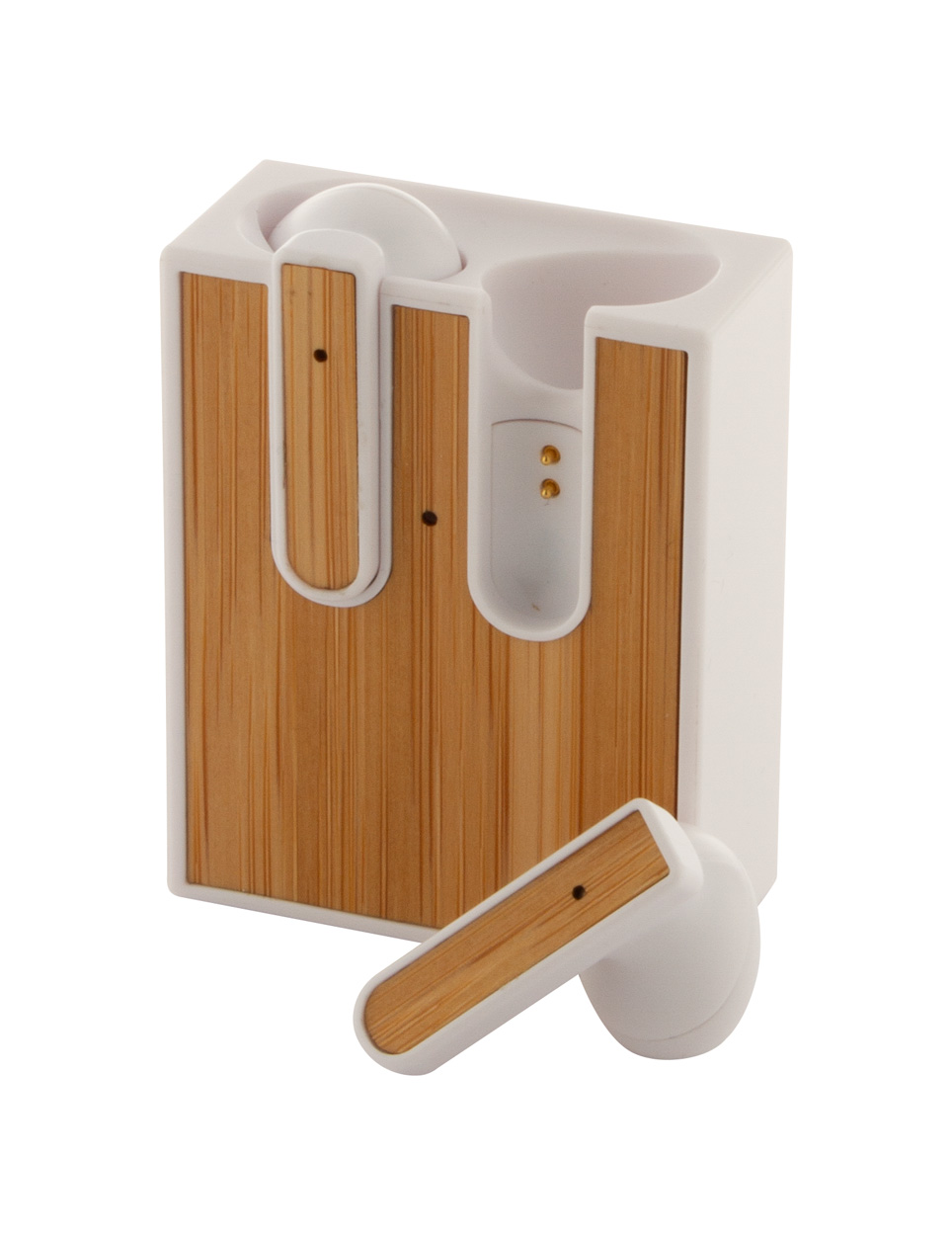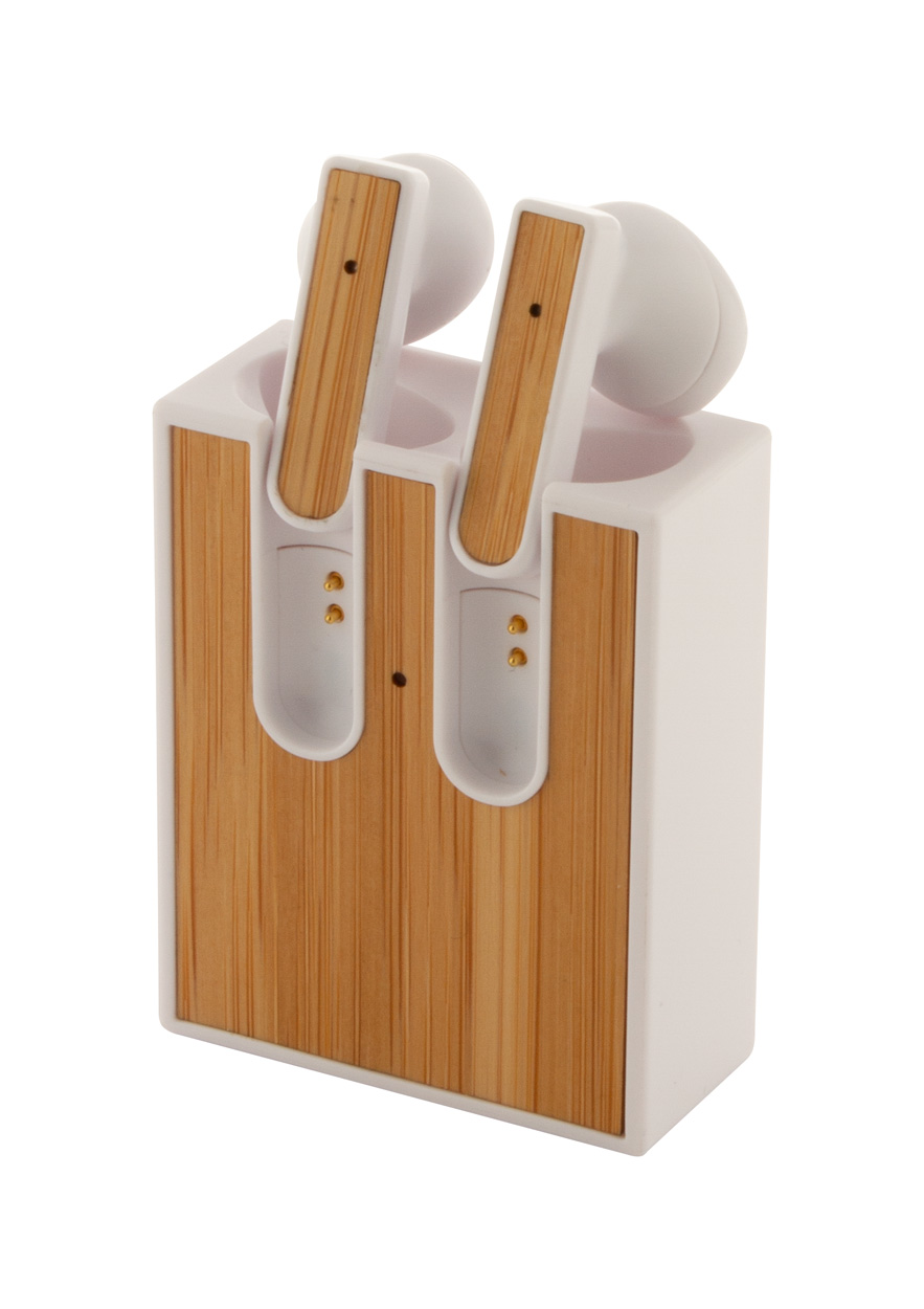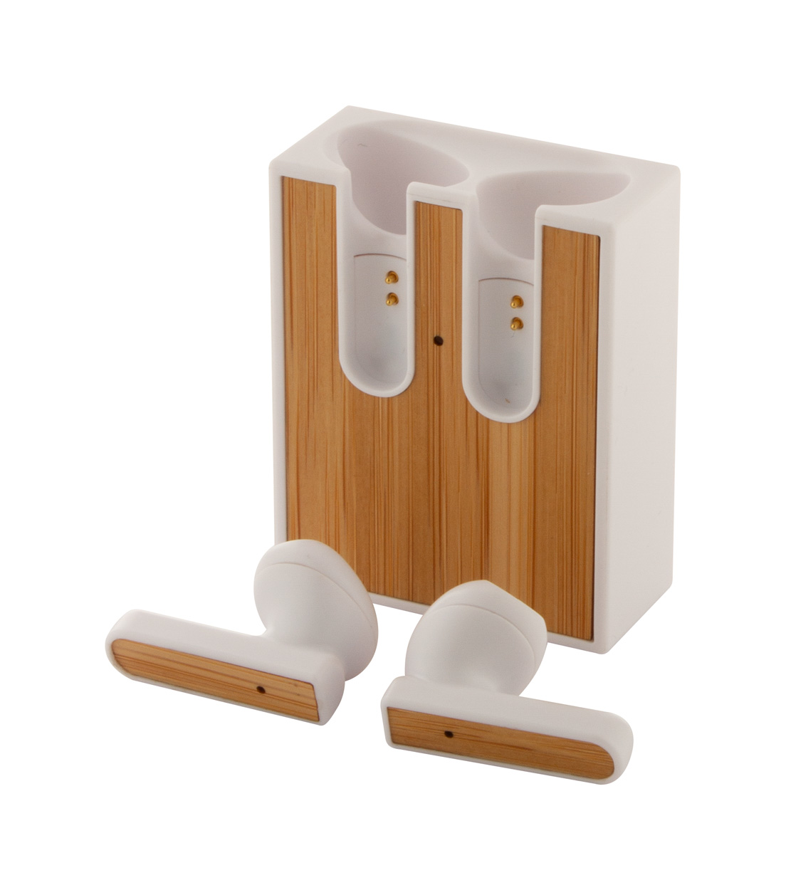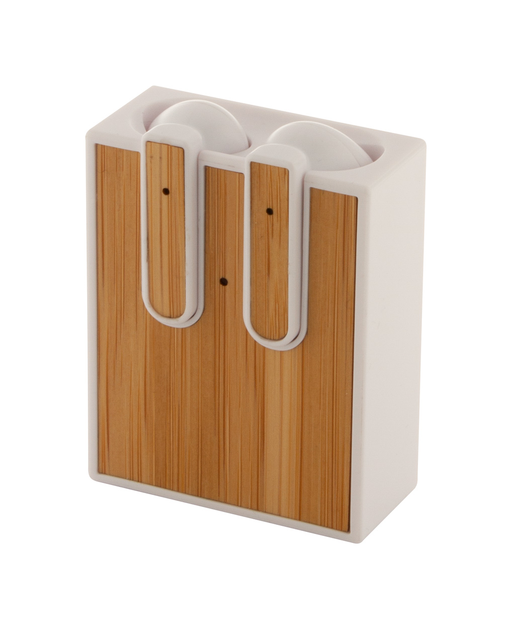 Echte kabellose Stereo-Ohrhörer (TWS) mit Bambus-Inlay und Freisprechfunktion. In einem Ladeetui aus recyceltem ABS-Kunststoff mit Bambus-Inlay. Inklusive USB-Ladekabel.