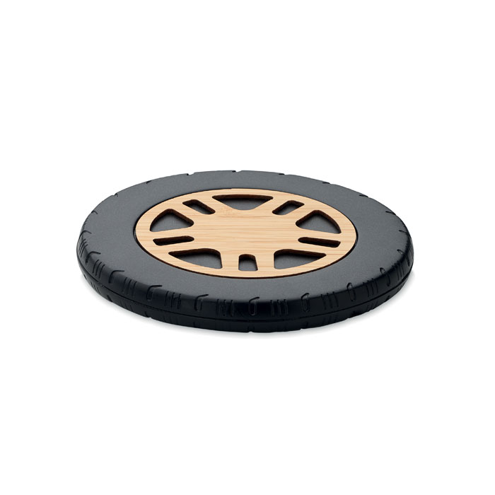 Kabellose Ladestation 15W in Optik eines Autoreifens. Recyceltes ABS mit Bambus-Dekor. Verbinden Sie das Gerät mit dem Computer und laden Sie Ihr Smartphone durch einfaches Auflegen auf. Ausgang: DC 9V/1.10A (15W) für schnelles Aufladen.