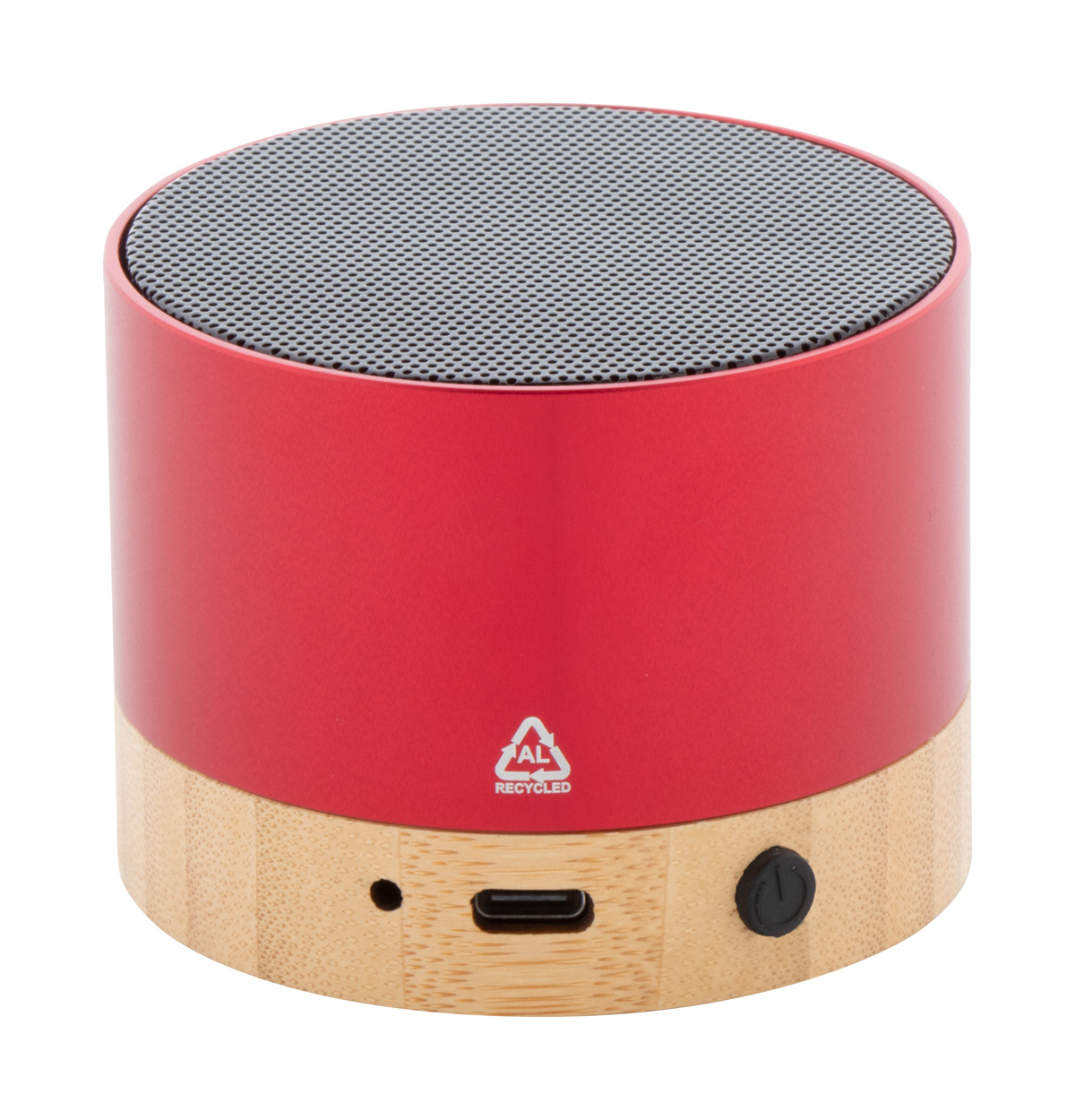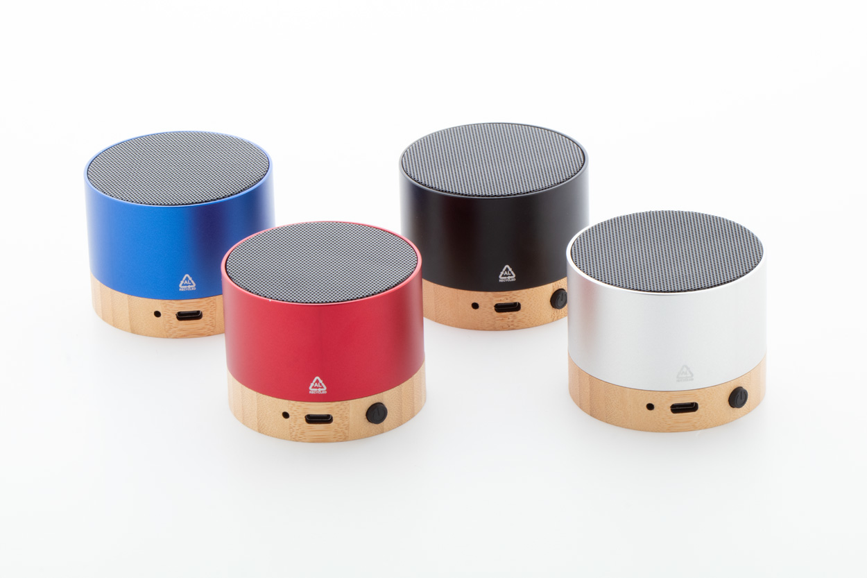 Kabelloser Lautsprecher aus recyceltem Aluminium mit Bambusfuß. Mit Freisprechfunktion und integrierter wiederaufladbarer Batterie. Inklusive USB-Ladekabel.