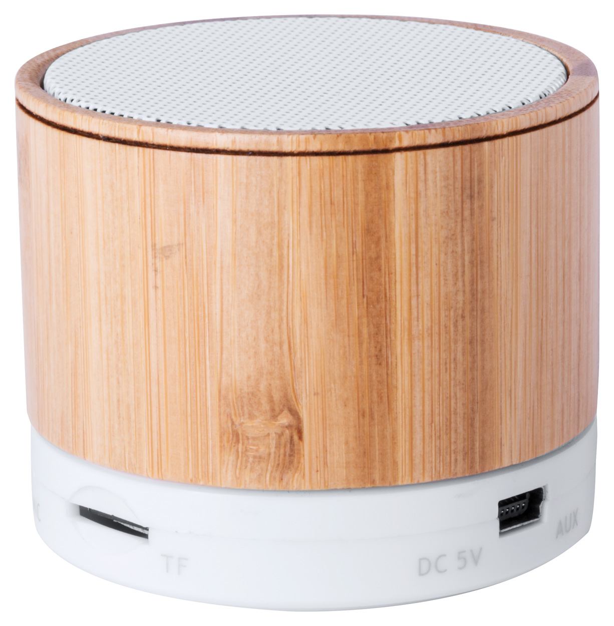 Kabelloser Lautsprecher im Bambusgehäuse mit Freisprechfunktion, FM-Radio und eingebautem Akku. Inklusive USB-Ladekabel.