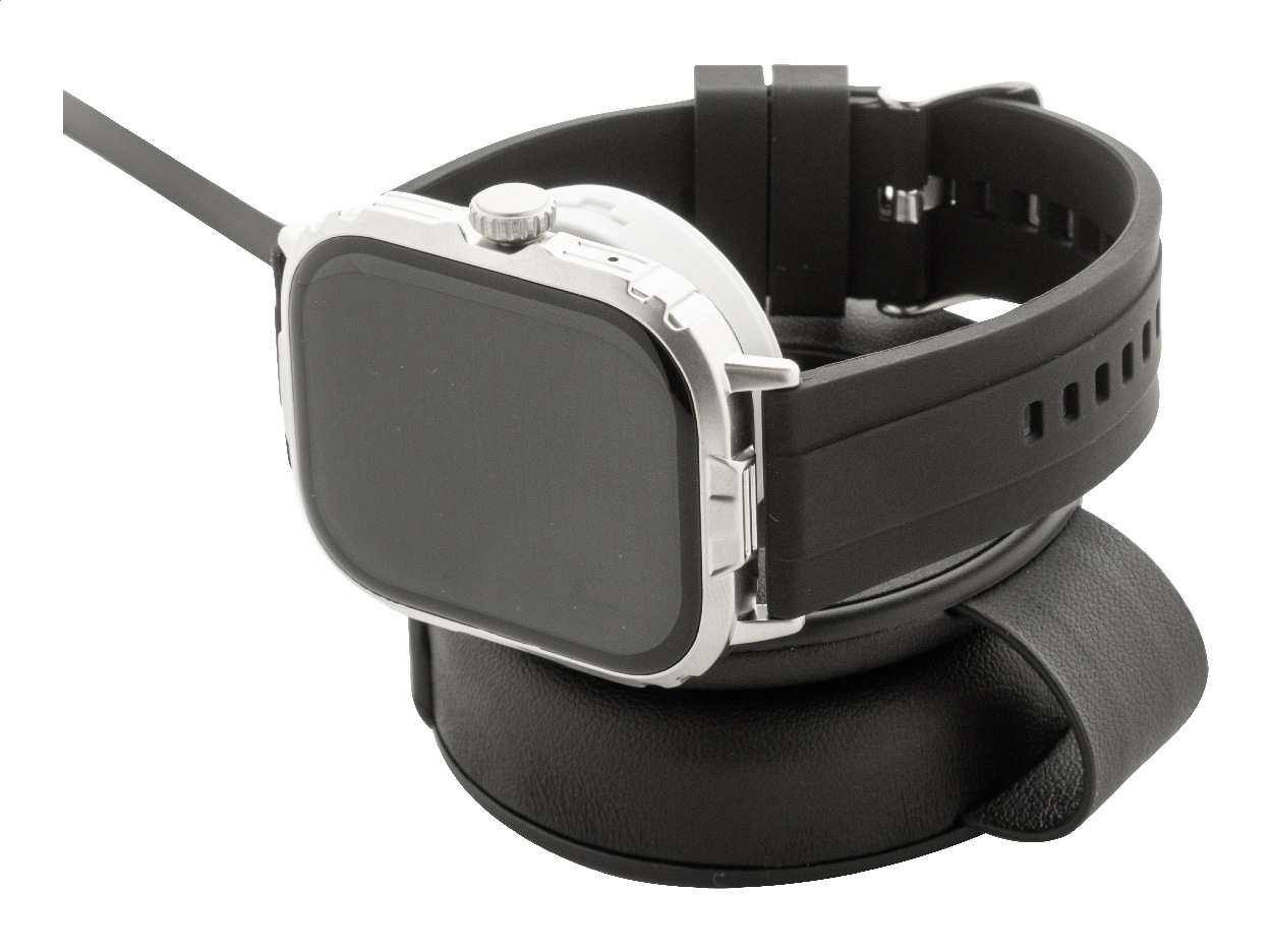 Hochwertiges, faltbares kabelloses Ladegerät-Set aus recyceltem PU-Leder mit magnetischem kabellosem Schnellladegerät (15 W), sekundärem kabellosem Ladegerät (2,5 W) für Smartwatches (Apple® und Samsung®) und integriertem ausziehbarem USB-C-Ladekabel. Inklusive selbstklebendem Metallring zur Nutzung der Magnetfunktion an jedem kabellos ladbaren Gerät. Kompatibel mit iPhone® 12 oder neuer.