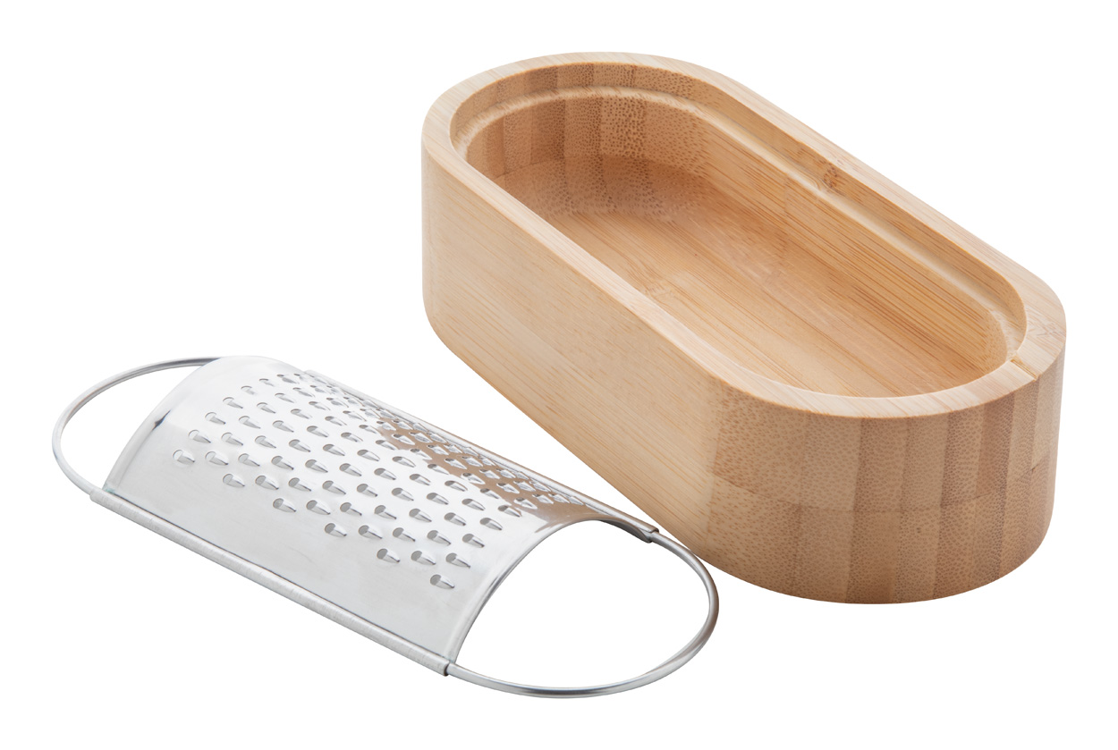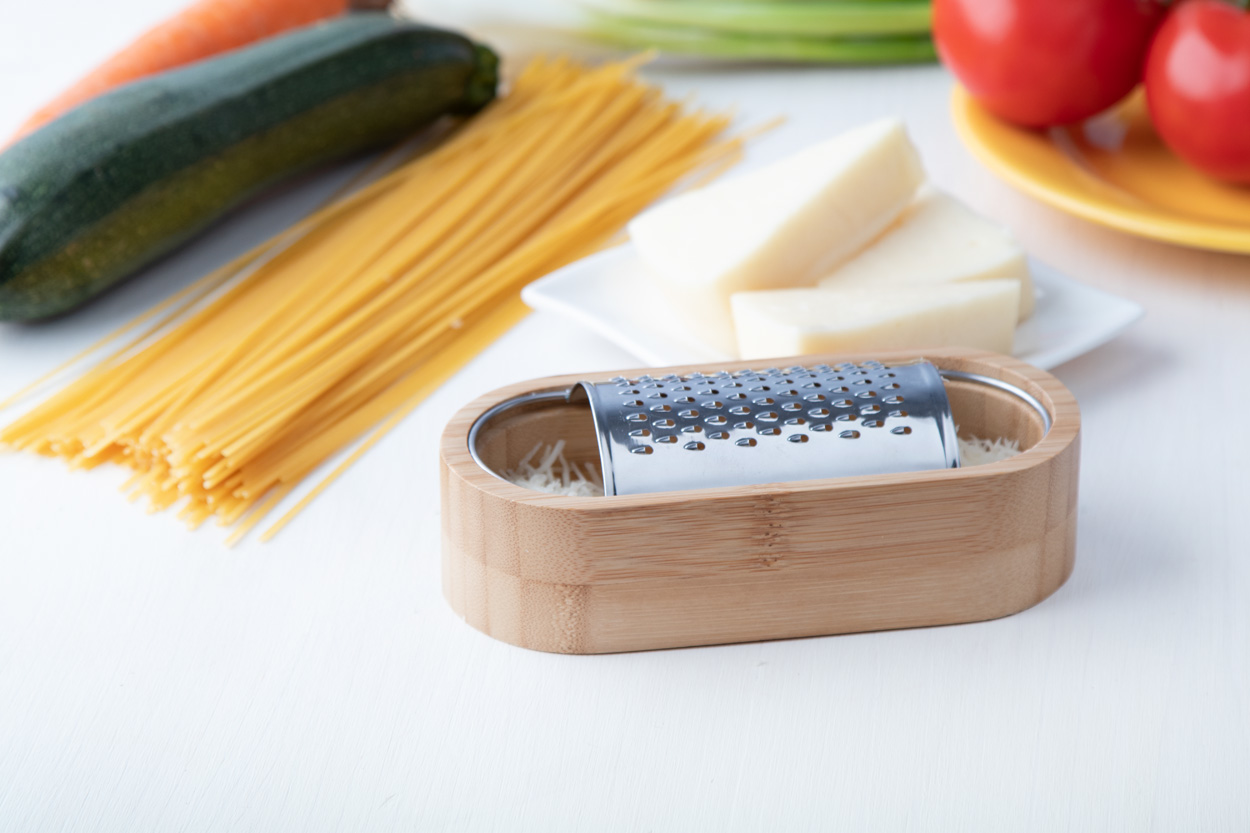 Käsereibe aus Edelstahl mit Bambus-Auffangbehälter.