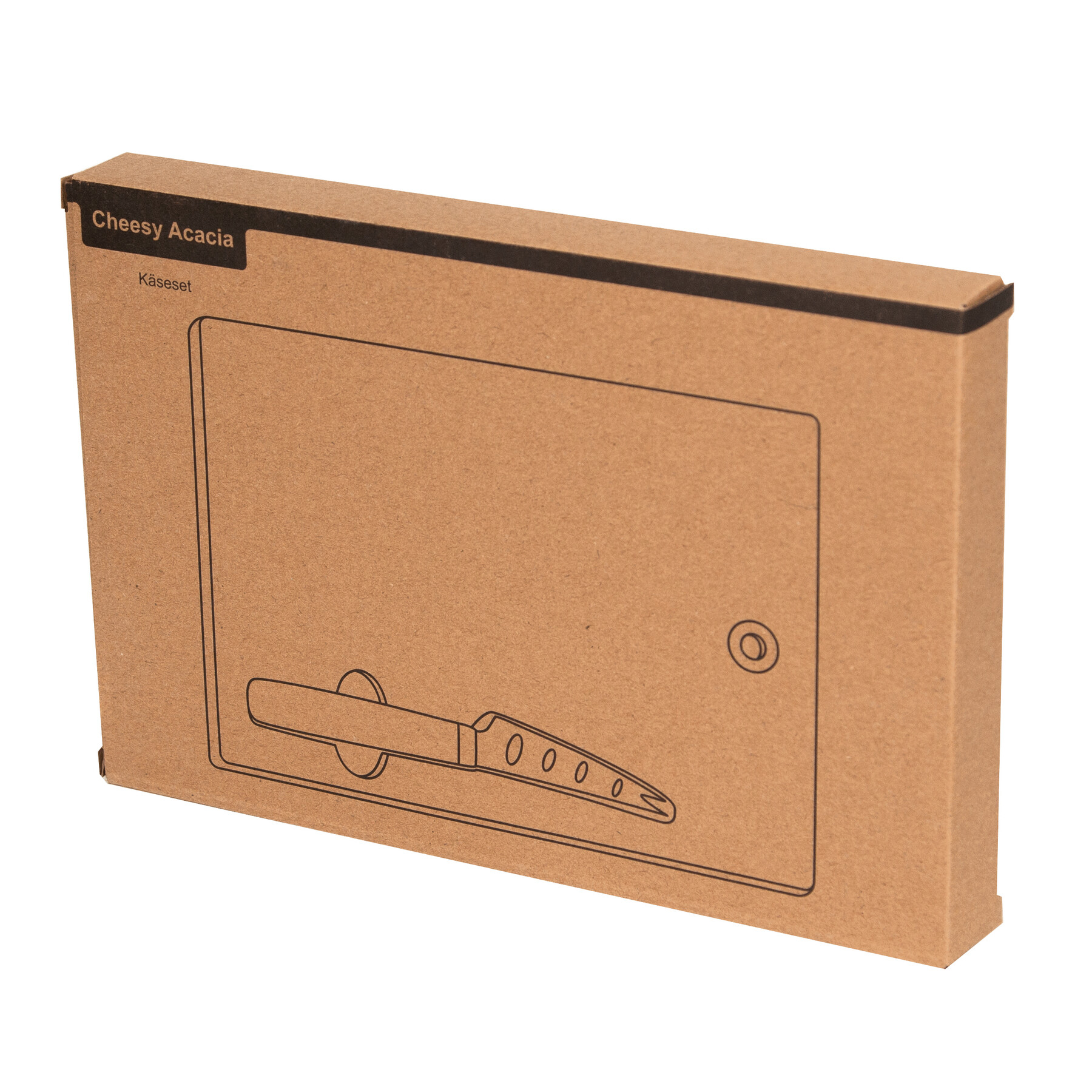 Käseset CHEESY ACACIA: bestehend aus Schneidebrett aus Akazienholz und Weichkäsemesser aus Edelstahl mit Akazienholzgriff, Messer lässt sich perfekt in Vertiefung mit Magnet verstauen, mit Edelstahl verstärktes Loch zum Aufhängen, in Box