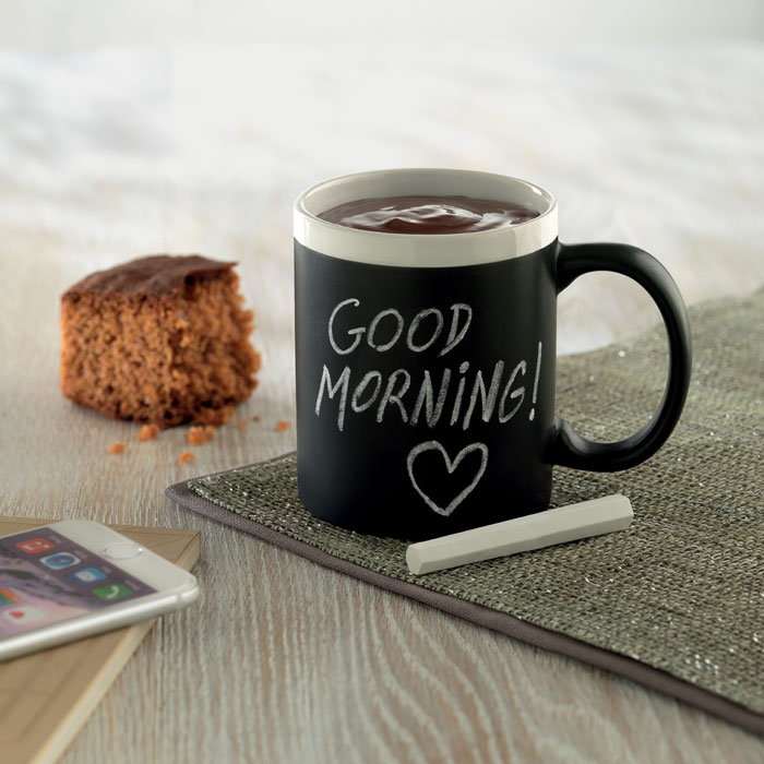 Kaffeebecher aus Keramik mit Tafelbeschichtung zum Beschriften. Füllmenge: 300 ml. Verpackt in einem weißen Karton.