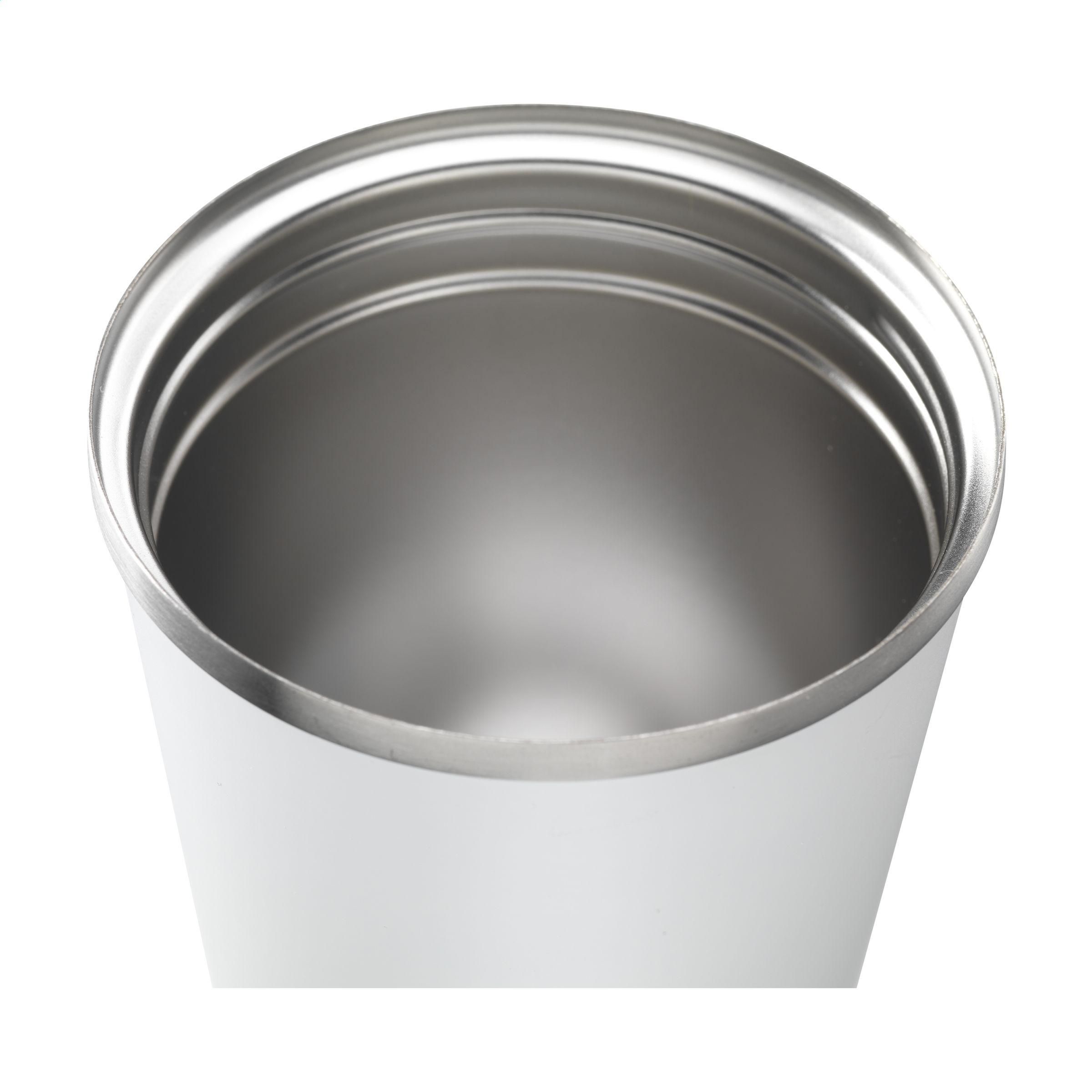 Doppelwandiger, auslaufsicherer Thermobecher aus recyceltem Edelstahl. Abgerundet mit einem matten Finish. Mit PP-Schraubdeckel, Klicköffnung und rutschfester Unterseite. Nicht spülmaschinengeeignet. RCS-zertifiziert. Recyceltes Material insgesamt: 77%. Fassungsvermögen 450 ml, gemessen bis zum Rand, ohne Deckel. Fassungsvermögen mit Deckel gemessen ca. 300 ml.Edelstahl kann viele Male recycelt werden – die Qualität des Materials bleibt dabei weitgehend erhalten. Durch die Verwendung von recyceltem Edelstahl kommt eine geringere Menge an neuen Rohstoffen zum Einsatz. Das bedeutet weniger Energieverbrauch und weniger Wasserverbrauch.