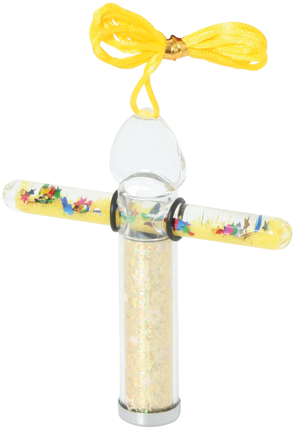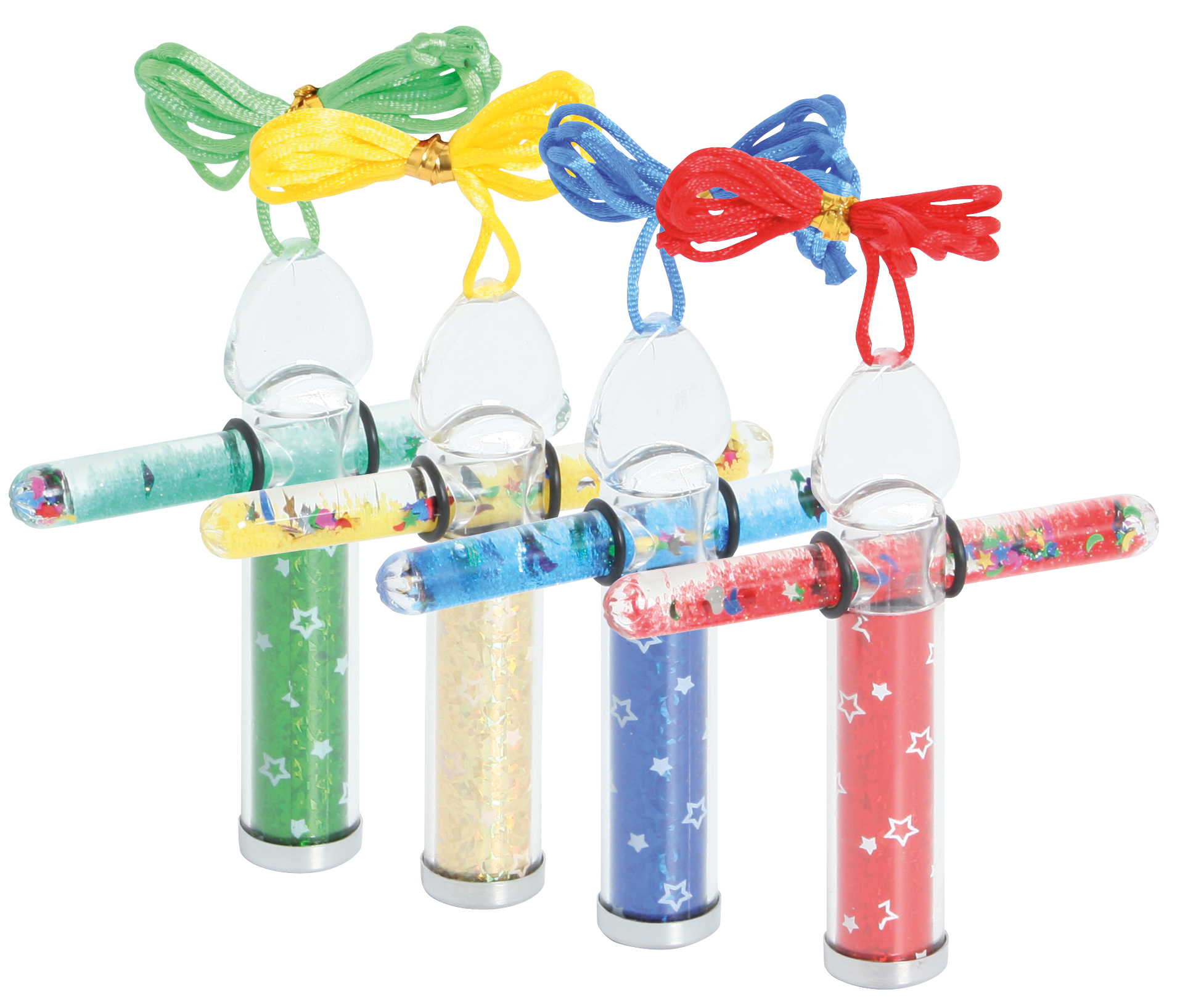 Mit Umhängeband. Runder Kunststoffkorpus. Verschiedene Farben sortiert. Länge Kaleidoskop: 10 cm. Länge Zauberstab: 9 cm.