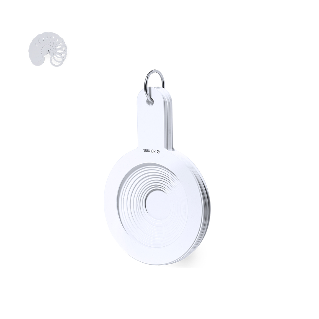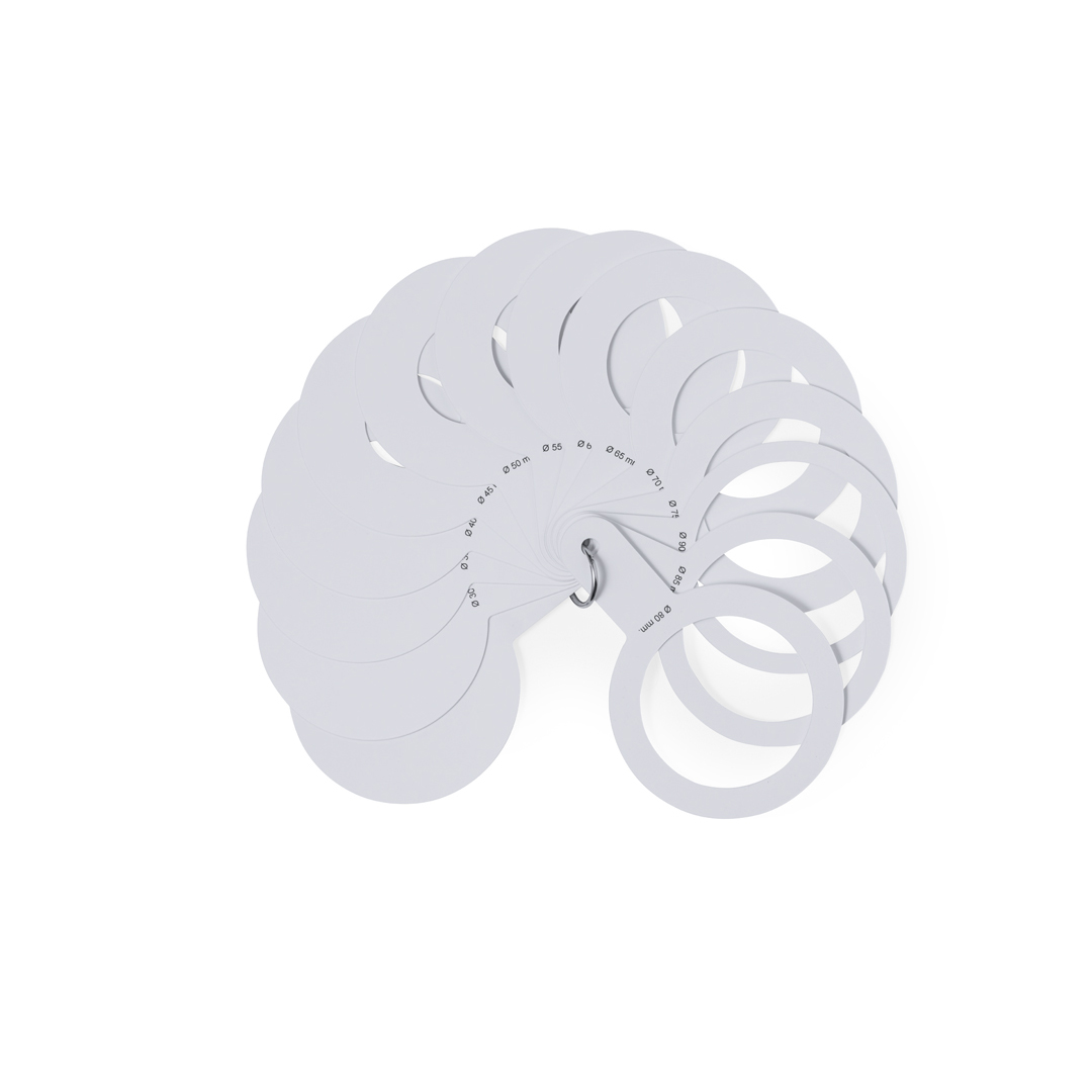 Manueller Messschieber aus widerstandsfähigem PP. Für Durchmesser von 30 mm bis 90 mm, ideal zum Messen und Sortieren in Echtzeit und nach Größe. Verfügt über 8 stufenweise ansteigende Schablonen alle 2 mm, eine davon mit einer flachen Oberfläche für das Branding. Verbunden durch einen praktischen Tragering.