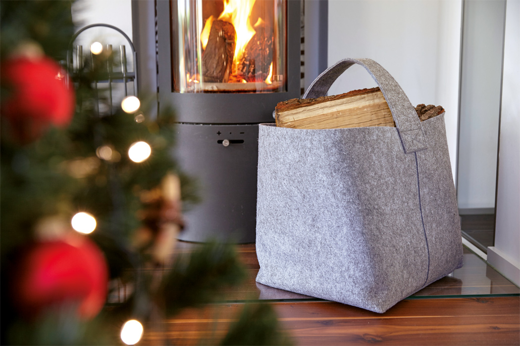 Kaminholz-Tasche COSY aus Filz: mit einem breiten Tragegurt – ideal für Transport und Lagerung von Feuerholz, auch geeignet zur Aufbewahrung von Zeitungen, Wolle etc., ausgelegt für max. 15 kg