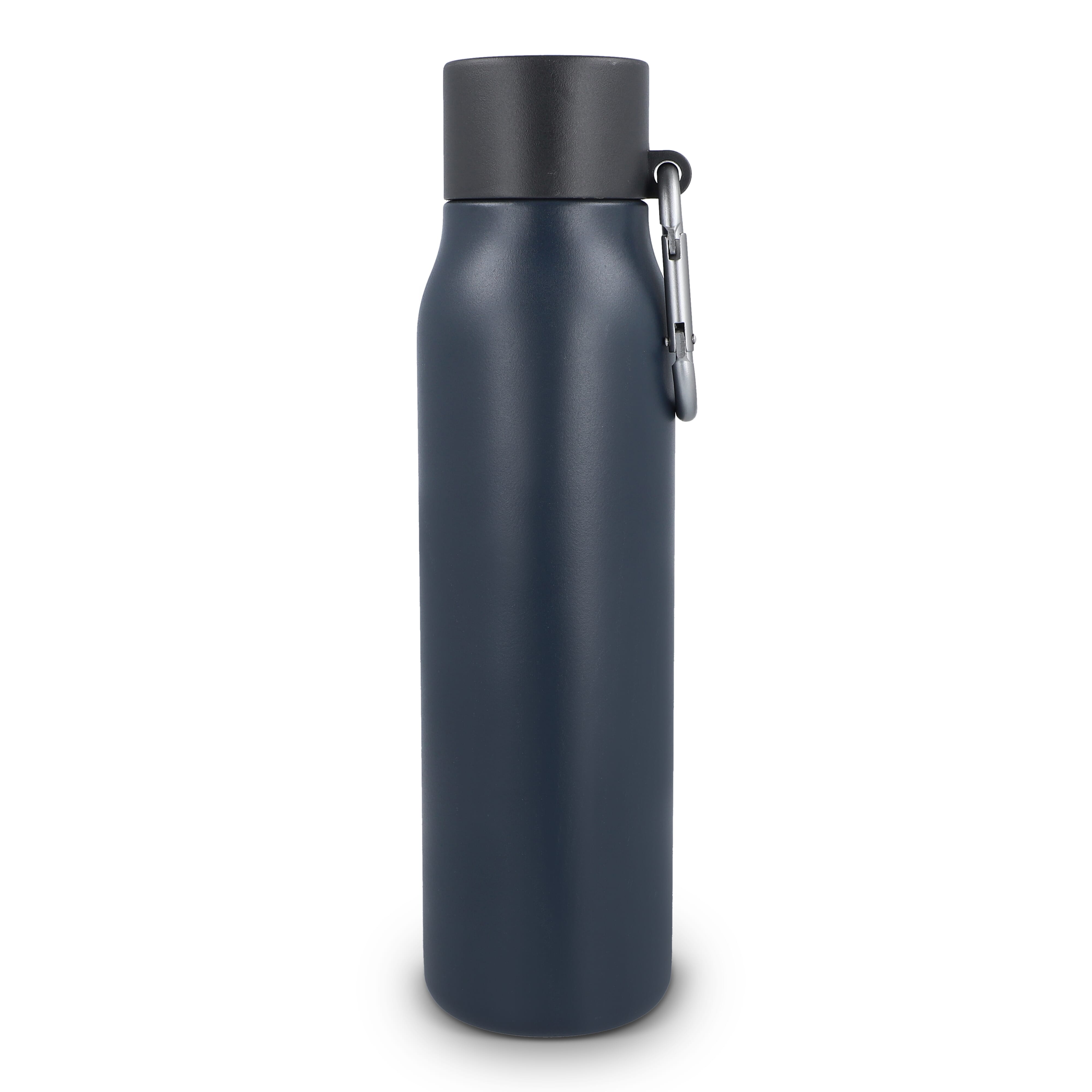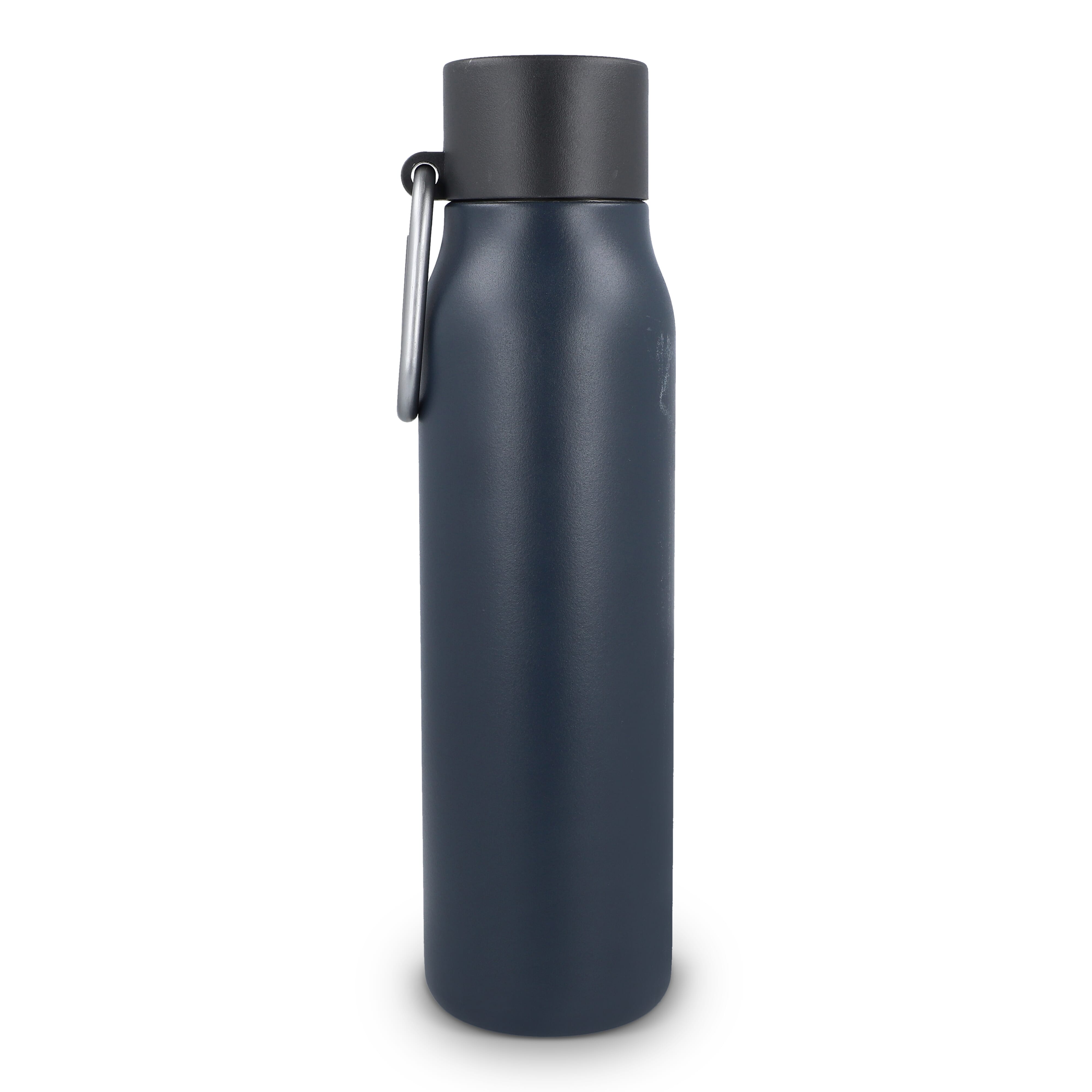 Solide 600-ml-Isolierflasche mit matter Oberfläche. Der Verschluss verfügt über einen Karabinerhaken zum Befestigen an Ihrer Tasche und zum einfachen Transportieren. Jede Flasche ist in einer Geschenkbox verpackt.