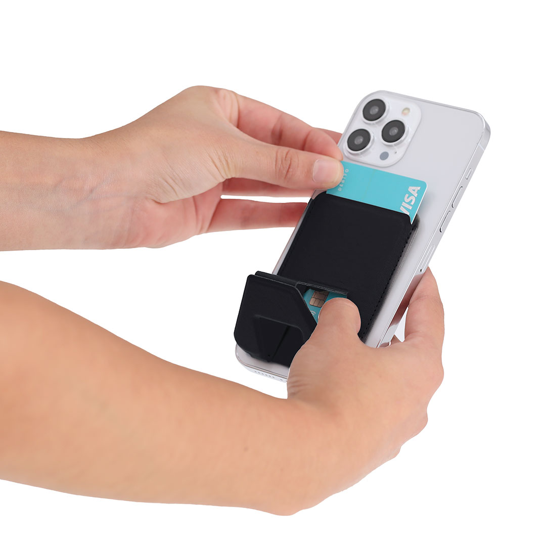 Kartenetui aus recyceltem PU. Mit multifunktionaler Halterung, die verschiedene Positionen erlaubt. Mit selbstklebendem Befestigungssystem. Enthält das Zeichen für recyceltes PU. Recyceltes PU zeichnet sich durch seine Haltbarkeit und Flexibilität aus. Dieses recycelte und recycelbare Material ist eine nachhaltige Option, die Abfallfasern aus den Herstellungsprozessen zurückgewinnt und somit Materialabfall minimiert und gleichzeitig den Umweltimpact reduziert, während es seine ursprünglichen Eigenschaften beibehält.