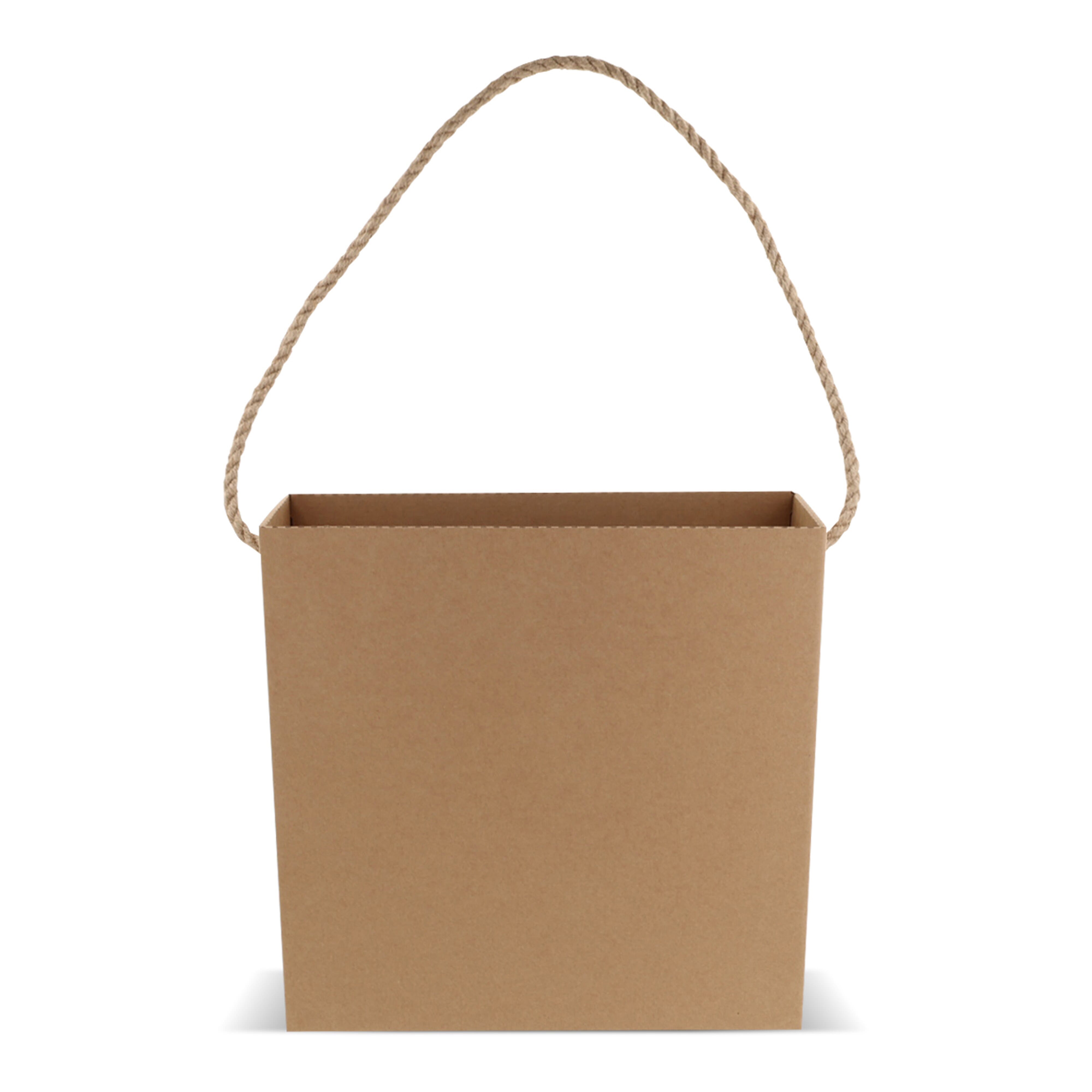 Quadratische Geschenktasche aus Karton. Nachhaltig, authentisch und einzigartig. Mit schweren natürlichen Jutegriffen. Hergestellt in Europa.
