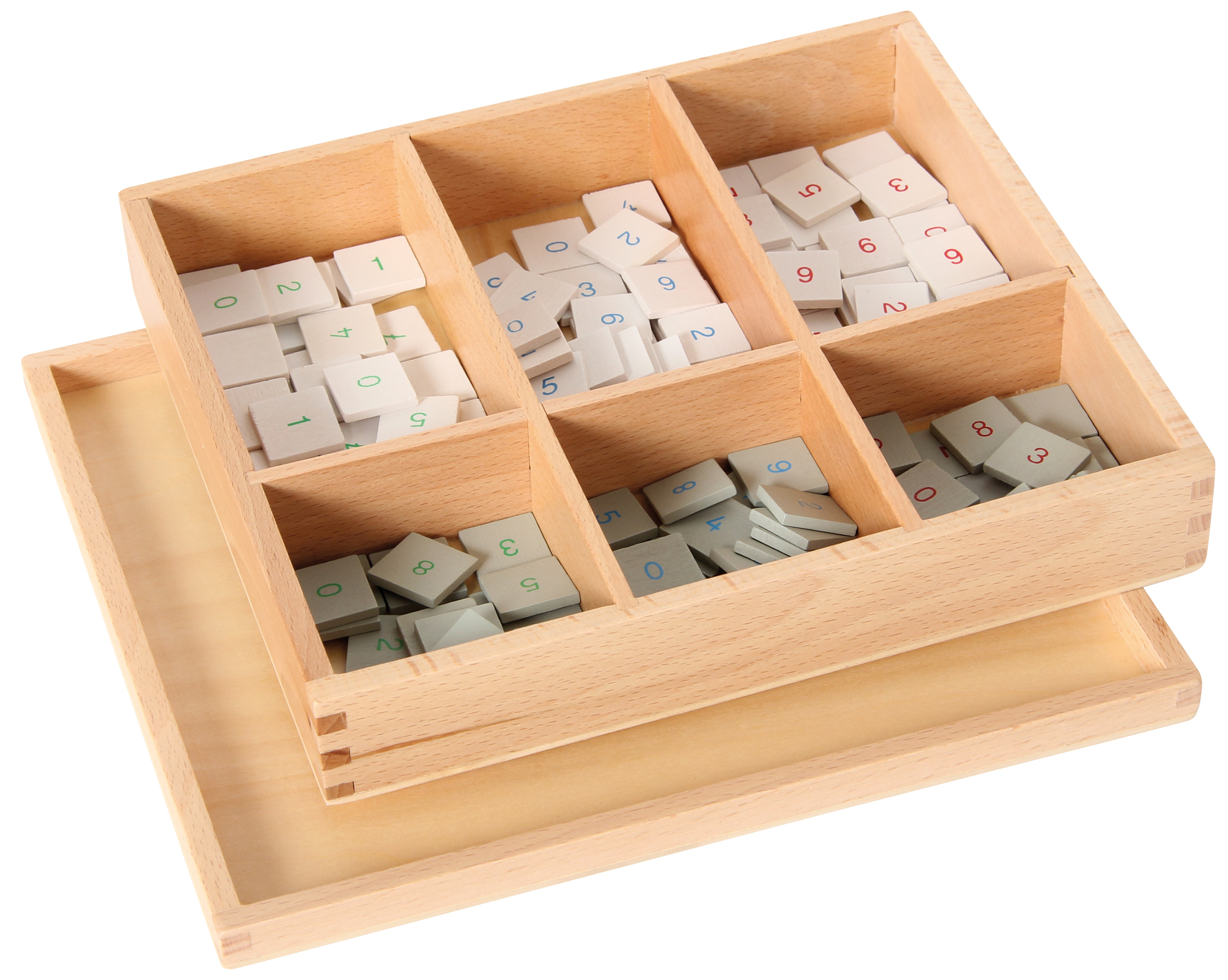 Das Material besteht aus einem Holzkasten mit Deckel und sechs Fächern. Darin sind 3 x 30 weiße und 3 x 20 graue Holzplättchen, jeweils mit den Ziffern 1 bis 9 in den Farben Grün, Blau und Rot. Dieses Material benötigt man zum Arbeiten mit dem Großen Multiplikationsbrett, Art.-Nr. 109581, und dem Multiplikationsbrett für Dezimalbrüche, Art.-Nr. 109850. Größe des Kastens: 24 x 22 x 4,5 cm.