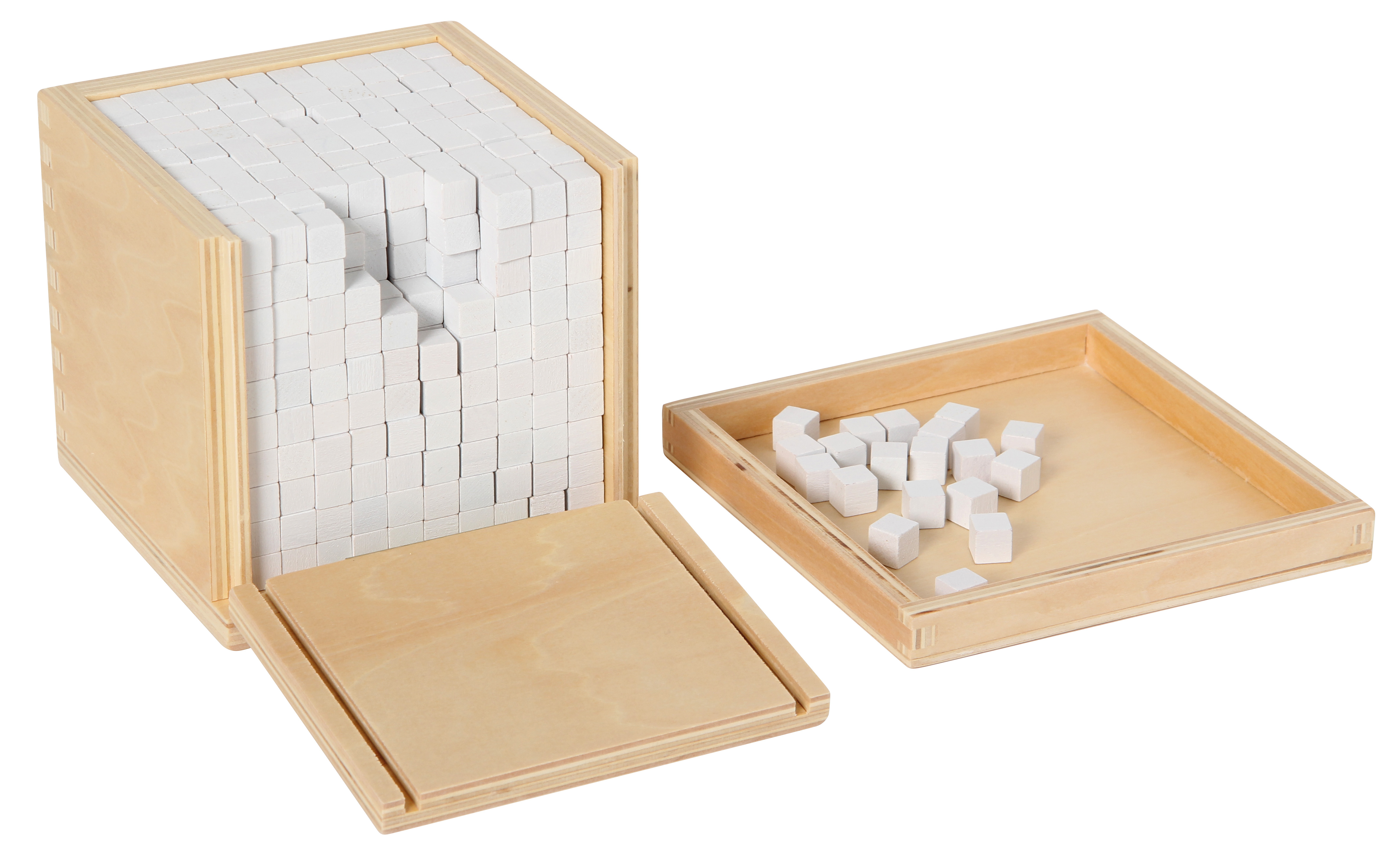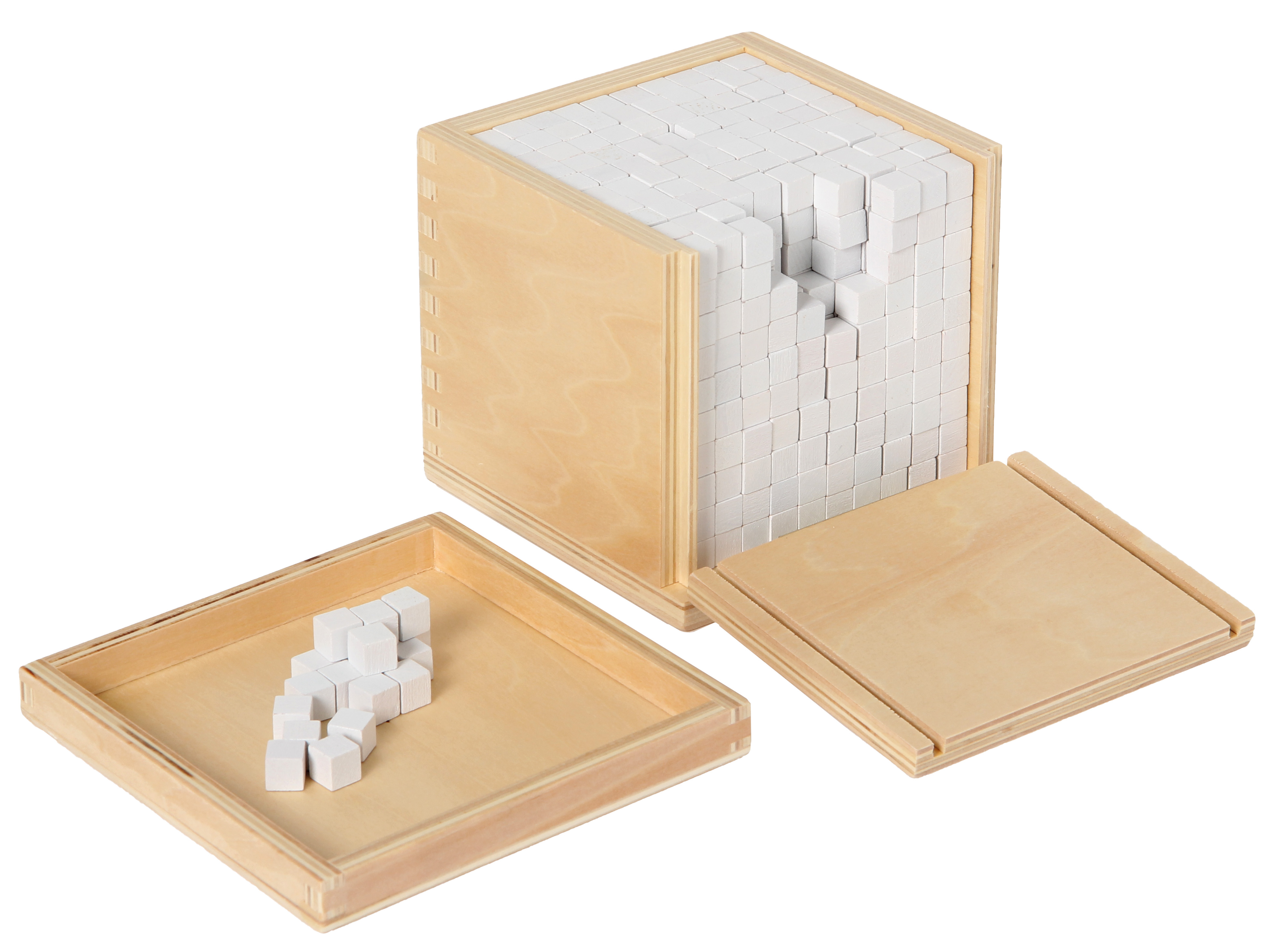 Der Holzkasten enthält 1000 Kuben aus Holz in der Größe 1 x 1 x 1 cm. Dieses Zählmaterial nutzen Kinder bei der Addition, Subtraktion, Multiplikation, Division, beim Potenzieren, Wurzelziehen, zur Flächen- und Volumenberechnung. Selbstkontrolle durch Material. Ab 4 Jahren. Kastengröße: 14 x 14 x 11 cm.