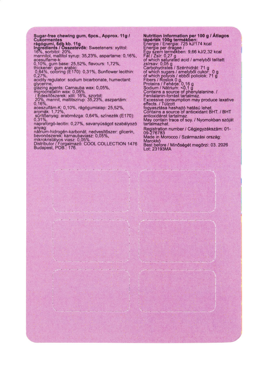 6 Stück zuckerfreier Kaugummi im Blister mit individuell gestalteter, vollfarbig bedruckter perforierter Papierhülle. Mindestmenge: 100 Stk.